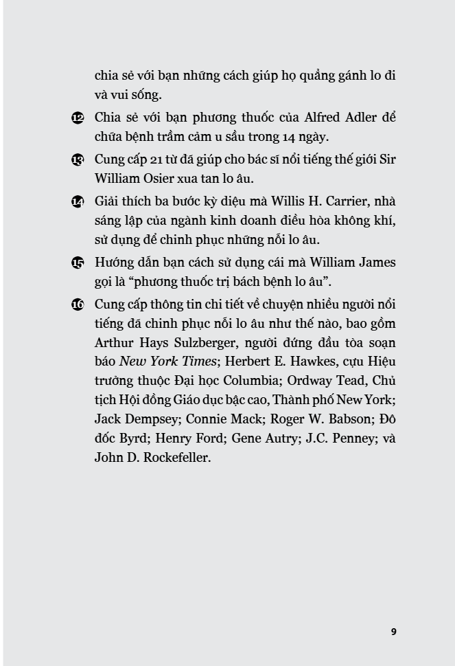 Quẳng gánh lo đi và vui sống của Dale Carnegie là một cuốn sách kinh điển về nghệ thuật sống bình an và vượt qua lo âu, đem lại cho người đọc các phương pháp thực tiễn để giảm bớt áp lực cuộc sống. Carnegie chia sẻ nhiều công cụ thiết thực giúp người đọc đối diện với nỗi lo một cách thông minh và hiệu quả. Qua những câu chuyện thực tế của những nhân vật nổi tiếng như bác sĩ William Osier hay Willis H. Carrier, tác giả minh họa các cách thức chinh phục lo âu, từ việc kiểm soát tâm trí cho đến việc chấp nhận và sống trong “khoang chắn ngày" – tập trung hoàn toàn vào hiện tại.