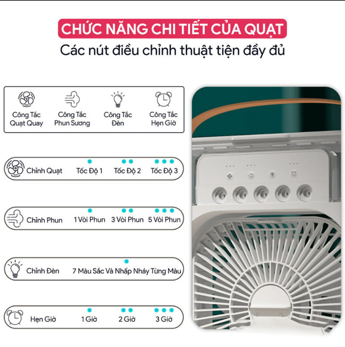 Quạt phun sương để bàn nhỏ gọn tiện lợi có 5 vòi phun sương quạt hơi nước kèm đèn led 7 màu tùy chỉnh có chế độ hẹn giờ cùng 3 chế độ phun sương