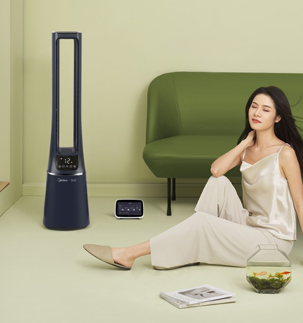 Quạt không cánh Midea AMS150E-TM, tích hợp chức năng lọc không khí được điều khiễn bằng ứng dụng thông minh.