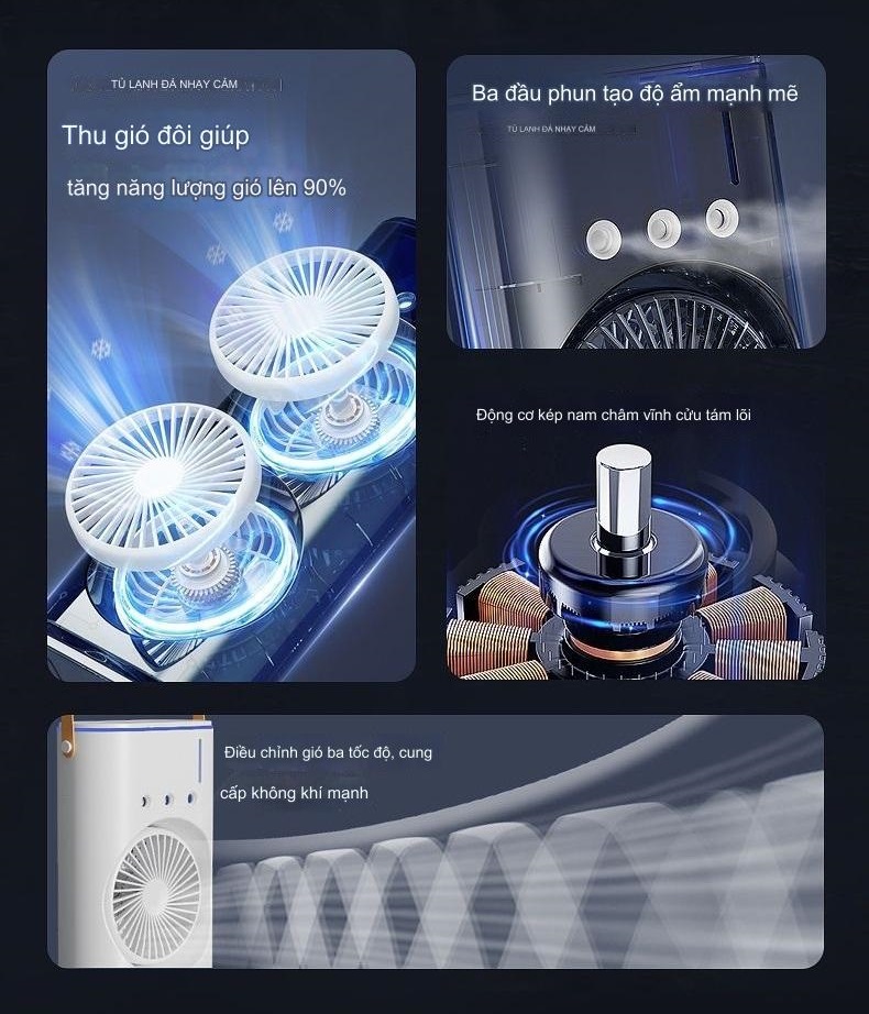 Bên trong tháp làm mát là động cơ kỹ thuật số BLDC hiện đại điều khiển 2 quạt làm mát tốc độ thay đổi và 3 tia phun sương.