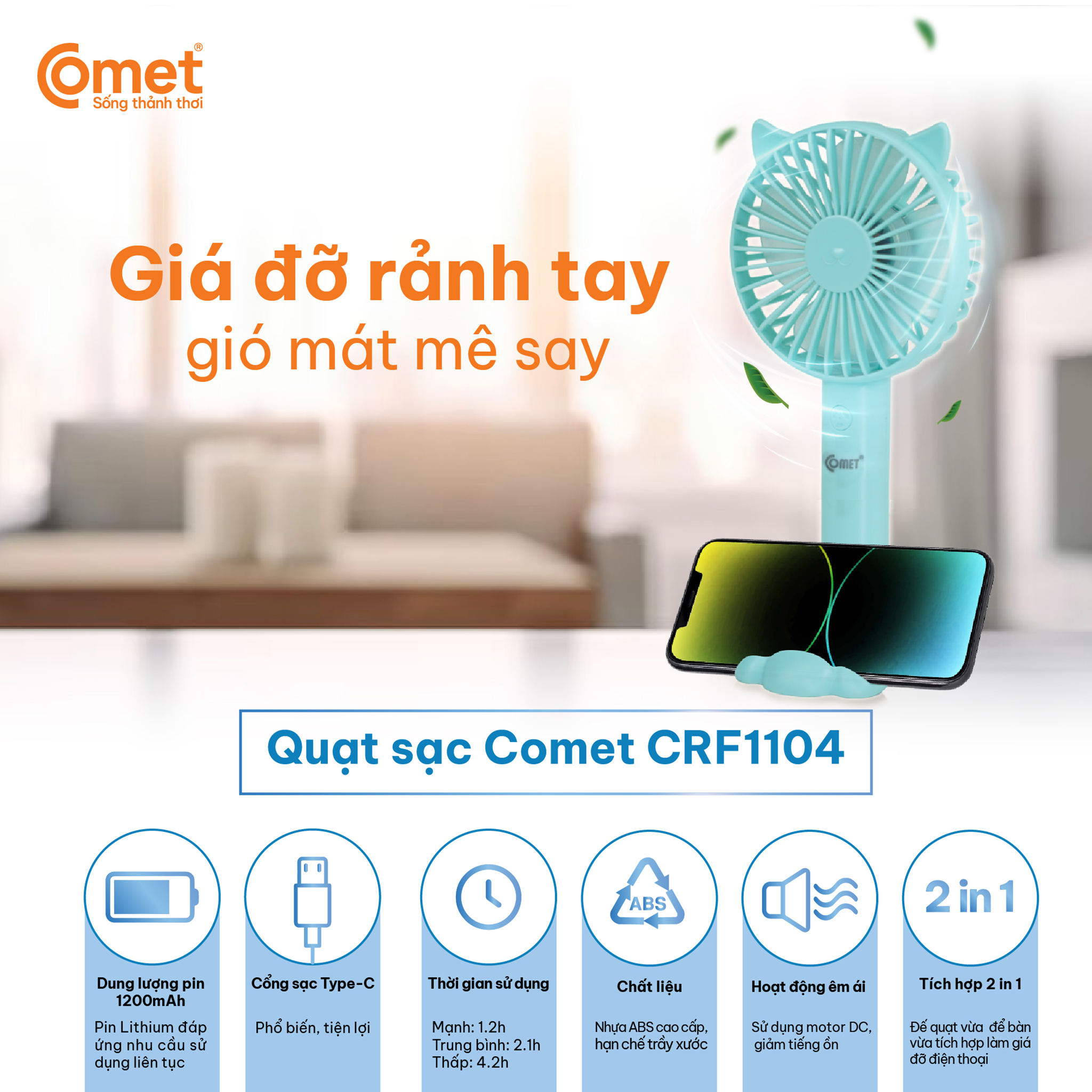 Quạt Sạc Cầm Tay COMET CRF1104 Công Suất 3W, Đế Sạc Rời Thiết kế nhỏ gọn, hiện đại với màu xanh trendy. Quạt Sạc Comet CRF1104 có thiết kế nhỏ gọn, đẹp mắt, có thể mang