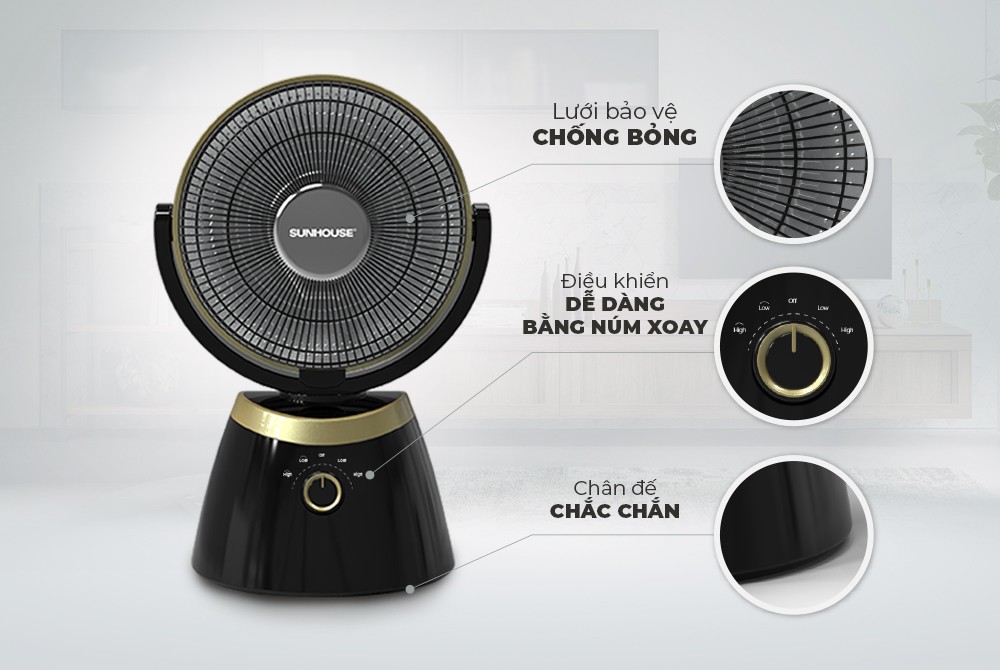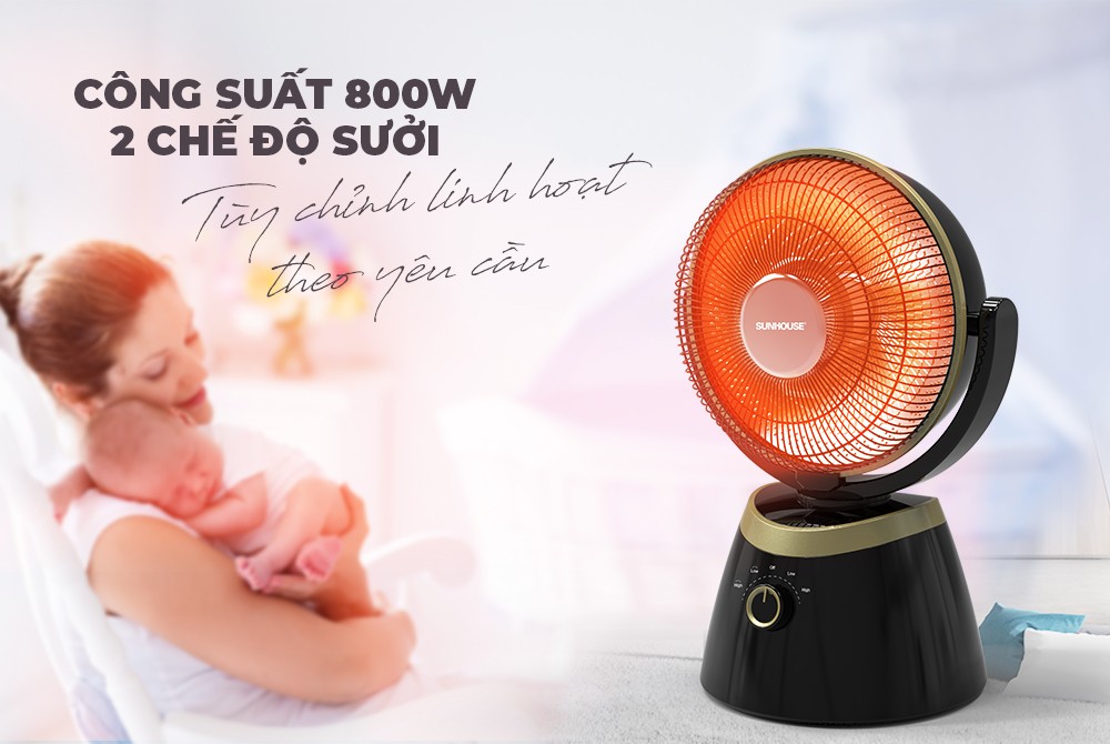 - Tự động ngắt khi nghiêng đổ, an toàn sử dụng Quạt sưởi carbon SUNHOUSE SHD7023 là một trong những thiết bị sưởi ấm không thể thiếu tại gia đình trong mùa đông. Sản phẩm tỏa nhiệt đều, làm ấm nhanh, không gây khó thở và khô da, đảm bảo an toàn cho người sử dụng, cùng thiết kế nhỏ gọn, dễ di chuyển giúp sử dụng linh hoạt trong nhiều không gian như phòng khách, phòng ngủ, phòng trẻ em…. Kiểu dáng nhỏ gọn, hiện đại, đề cao tính tiện lợi Quạt sưởi carbon SUNHOUSE SHD7008 có thiết kế nhỏ gọn, kiểu dáng hiện đại và bắt mắt, tiết kiệm diện tích và phù hợp mọi không gian như phòng khách, phòng ngủ,ới trọng lượng nhẹ, bạn có thể dễ dàng di chuyển quạt sưởi và đặt sưởi ở bất kì vị trí nào trong phòng vô cùng tiện lợi. Điều khiển dễ dàng bằng núm xoay SUNHOUSE SHD7008 có 2 mức công suất cùng 2 chế độ quay đảo chiều, điều chỉnh bằng núm xoay trên thân quạt giúp bạn dễ dàng lựa chọn được mức nhiệt phù hợp với môi trường và nhu cầu sử dụng. Lổng bảo vệ chống bỏng, an toàn SUNHOUSE SHD7008 được trang bị một lồng kim loại bảo vệ bên ngoài, cách ly với bộ phận tỏa nhiệt phía trong, giúp bảo vệ bạn tránh khỏi nguy cơ bị bỏng nếu vô tình chạm tay vào quạt sưởi. Chắc chắn, bền đẹp, an toàn Quạt sưởi carbon SUNHOUSE SHD7008 có chân đế vững chãi, chắc chắn. Chất liệu bền, ít bám bụi, giúp sản phẩm luôn như mới trong quá trình sử dụng. TỎA NHIỆT ĐỀU, KHÔNG GÂY KHÔ DA Làm ấm cực nhanh, không gây khô da SUNHOUSE SHD7008 có công suất 800W, cùng 2 chế độ sưởi làm ấm cực nhanh, công nghệ sưởi ấm hiện đại không đốt cháy oxy nên không gây khó thở hay khô da khi dùng. Bạn có thể tùy chỉnh và lựa chọn 2 chế độ sưởi tương ứng với 2 mức nhiệt để phù hợp với thời tiết và nhu cầu sử dụng, vô cùng tiện lợi. Đèn sưởi carbon chống chói mắt, độ bền cao Sản phẩm sử dụng đèn sưởi carbon không gây chói mắt khi hoạt động, tuổi thọ vượt trội, làm ấm nhanh cho cả gia đình. Chế độ quay 4 chiều tiện lợi Đặc biệt, SUNHOUSE SHD7008 được trang bị khả năng quay 4 chiều tiện lợi, với 2 tốc độ quay tùy chỉnh giúp làm ấm đều khắp phòng, luồng nhiệt không bị tập trung vào một khu vực gây chênh lệch nhiệt độ phòng. Đây cũng là điểm cộng vô cùng lớn của quạt sưởi SUNHOUSE so với các sản phẩm quạt sưởi điện khác trên thị trường. An toàn với người sử dụng SUNHOUSE SHD7008 có chế độ tự động ngắt điện khi bị nghiêng đổ cùng chân đế vững chắc, lồng bảo vệ chống bỏng, an toàn tuyệt đối khi sử dụng trong gia đình. Thông số kỹ thuật
