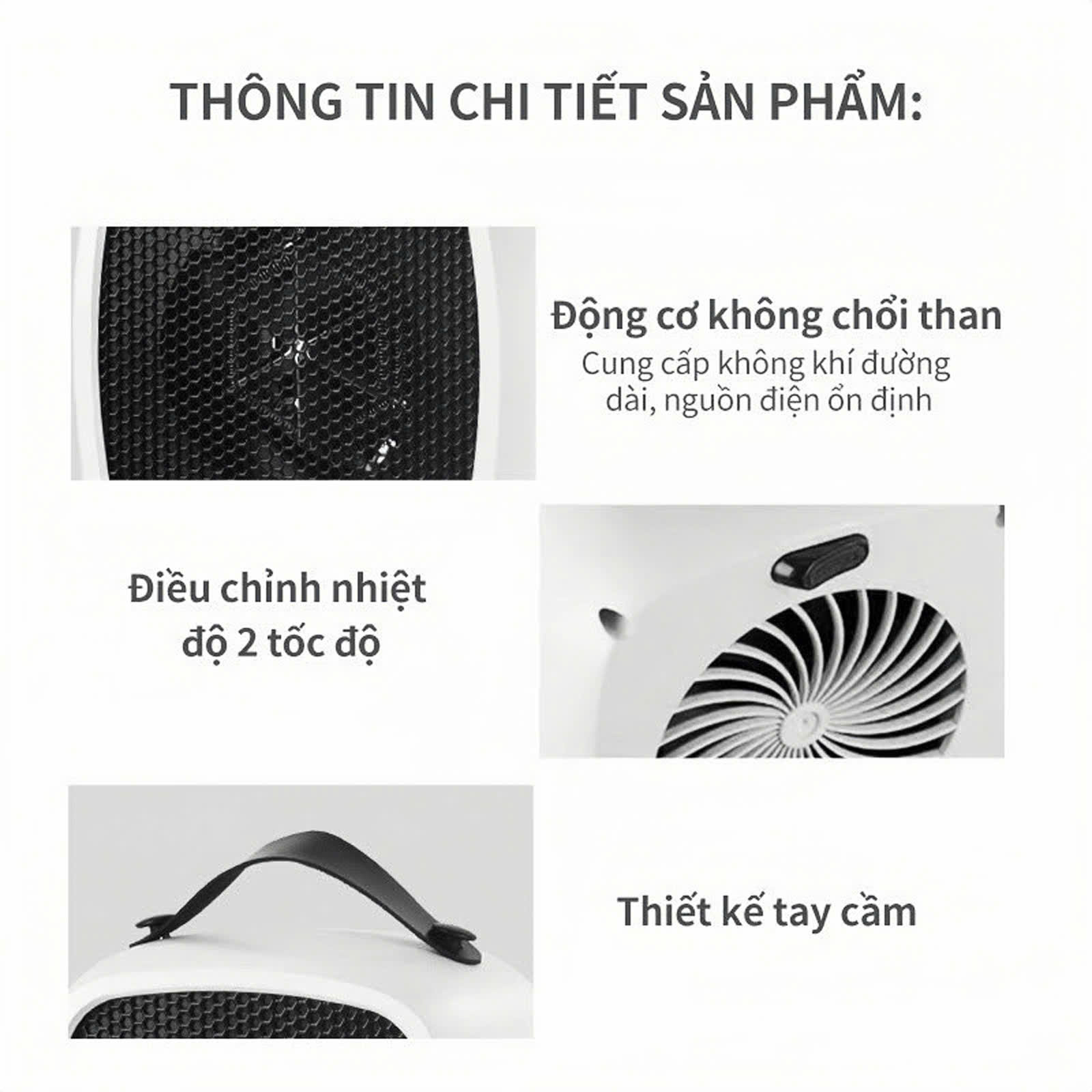 Quạt sưởi sử dụng cho mùa đông và mùa hè · Chất liệu: Nhựa cao cấp · Chế độ tự ngắt khi quá nhiệt · Thanh nhiệt làm ấm nhanh trong thời gian ngắn ·