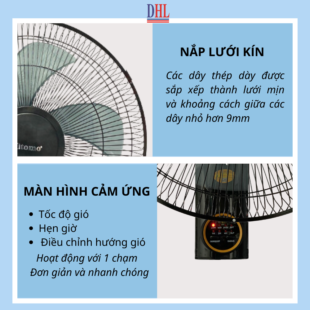 có kiểu dáng hiện đại, thiết kế treo tường tiết kiệm diện tích Lồng quạt đan khít rất an toàn cho người dùng, chất liệu cao cấp ít bám bụi, dễ 3 cánh quạt