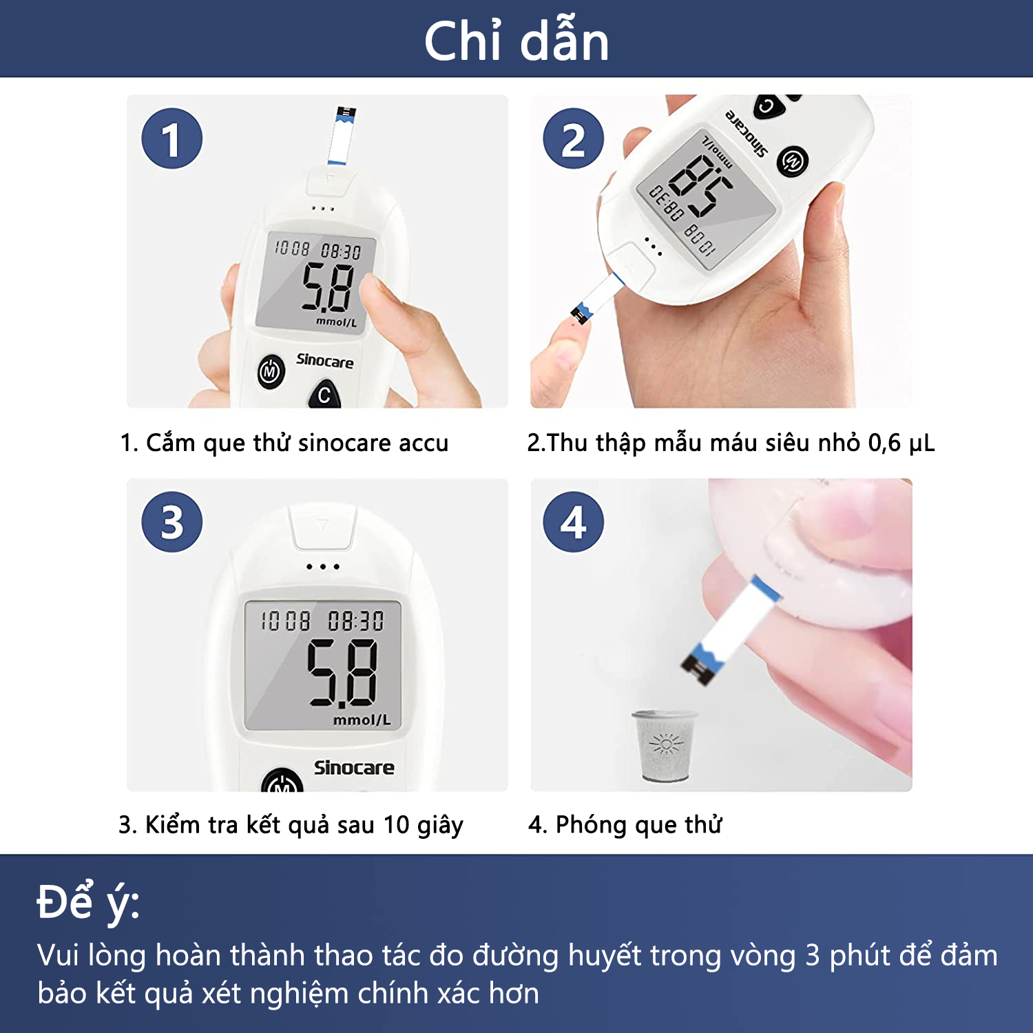 Các bước đo đường huyết bằng máy Sinocare Safe Accu