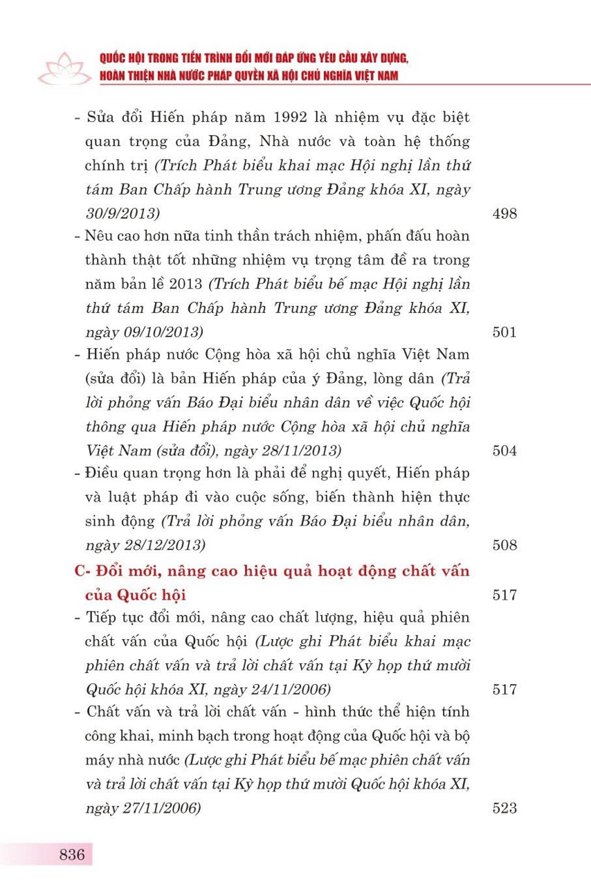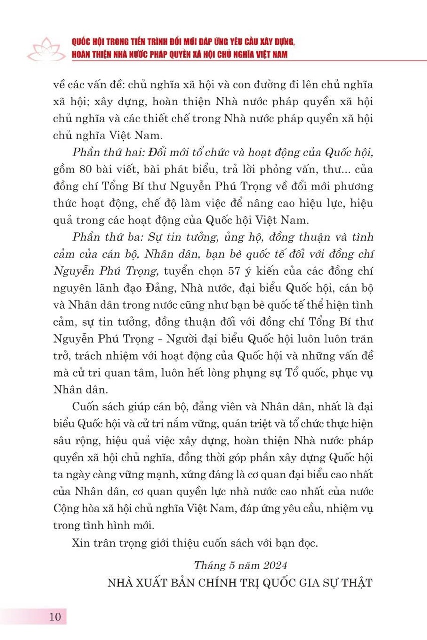 Nhằm hệ thống những quan điểm chỉ đạo và định hướng của đồng chí Tổng Bí thư Nguyễn Phú Trọng đối với nhiệm vụ xây dựng, hoàn thiện Nhà nước pháp quyền xã hội chủ nghĩa Việt Nam nói chung và đổi mới tổ chức, hoạt động của Quốc hội Việt Nam nói riêng, Đảng đoàn Quốc hội phối hợp với Nhà xuất bản Chính trị quốc gia Sự thật xuất bản cuốn sách: Quốc hội trong tiến trình đổi mới đáp ứng yêu cầu xây dựng, hoàn thiện Nhà nước pháp quyền xã hội chủ nghĩa Việt Nam.