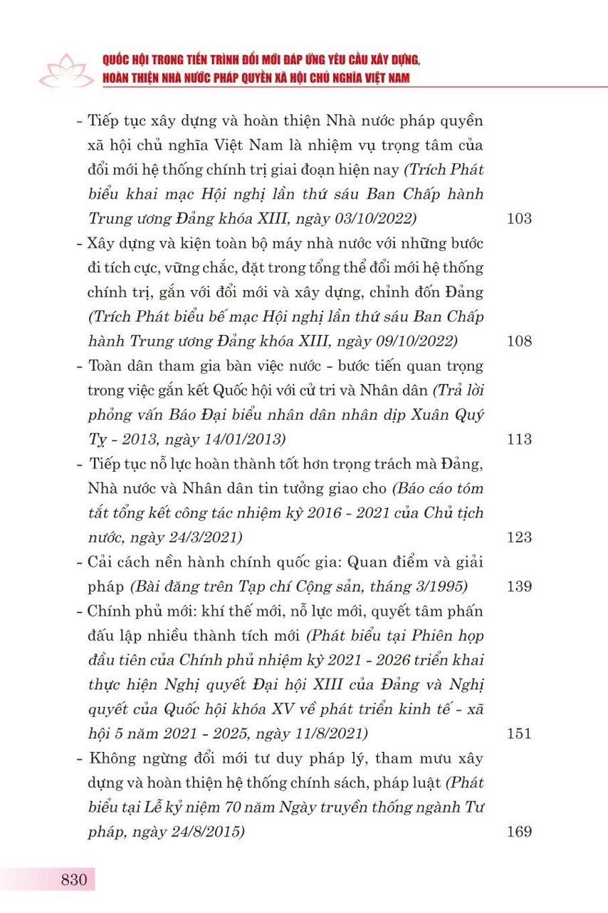 Cuốn sách tuyển chọn 95 bài viết, bài phát biểu và trả lời phỏng vấn của đồng chí Tổng Bí thư Nguyễn Phú Trọng về xây dựng, hoàn thiện Nhà nước pháp quyền xã hội chủ nghĩa Việt Nam và Quốc hội Việt Nam; tuyển chọn hơn 100 bức ảnh tư liệu quý và 57 ý kiến tiêu biểu của các đồng chí nguyên lãnh đạo Đảng, Nhà nước, đại biểu Quốc hội, Nhân dân và bạn bè quốc tế. Các bài viết, bài phát biểu trong cuốn sách thể hiện tư duy nhất quán và sự lãnh đạo toàn diện của đồng chí Tổng Bí thư đối với vấn đề đổi mới tổ chức, nâng cao hiệu lực, hiệu quả hoạt động của Quốc hội và xây dựng, hoàn thiện Nhà nước pháp quyền xã hội chủ nghĩa Việt Nam trong giai đoạn hiện nay.