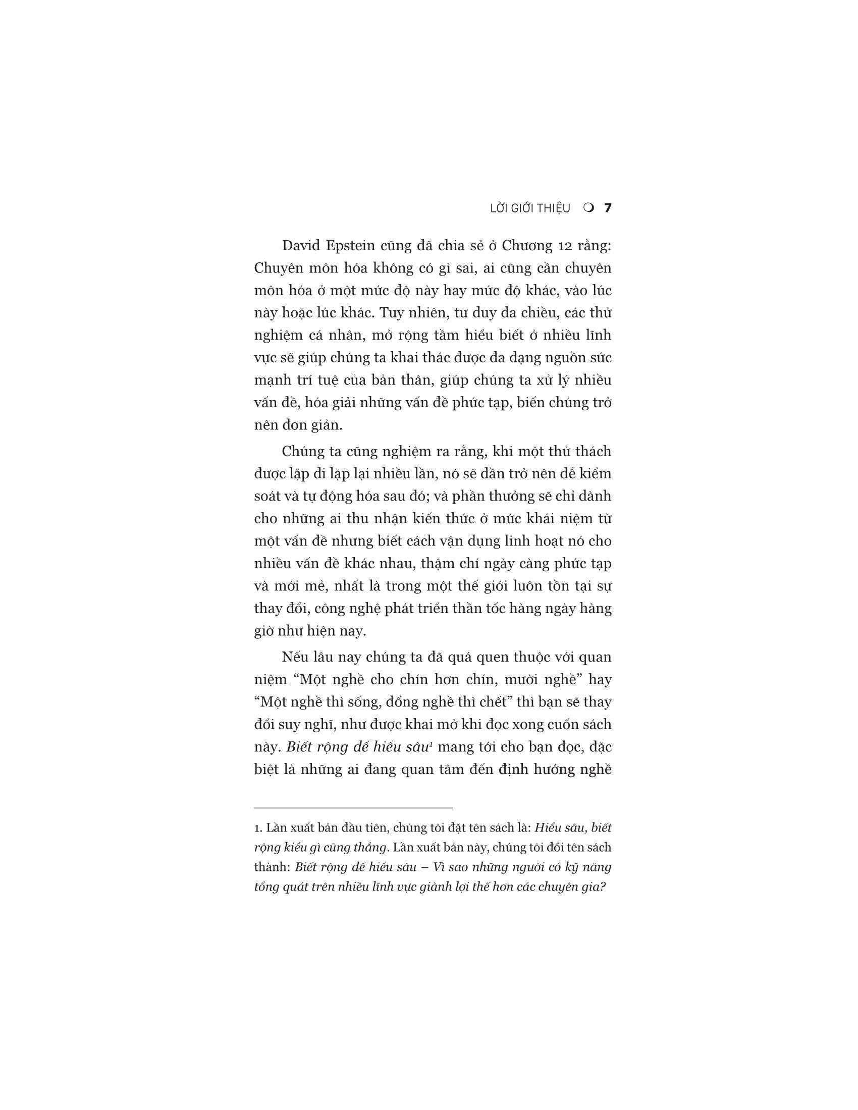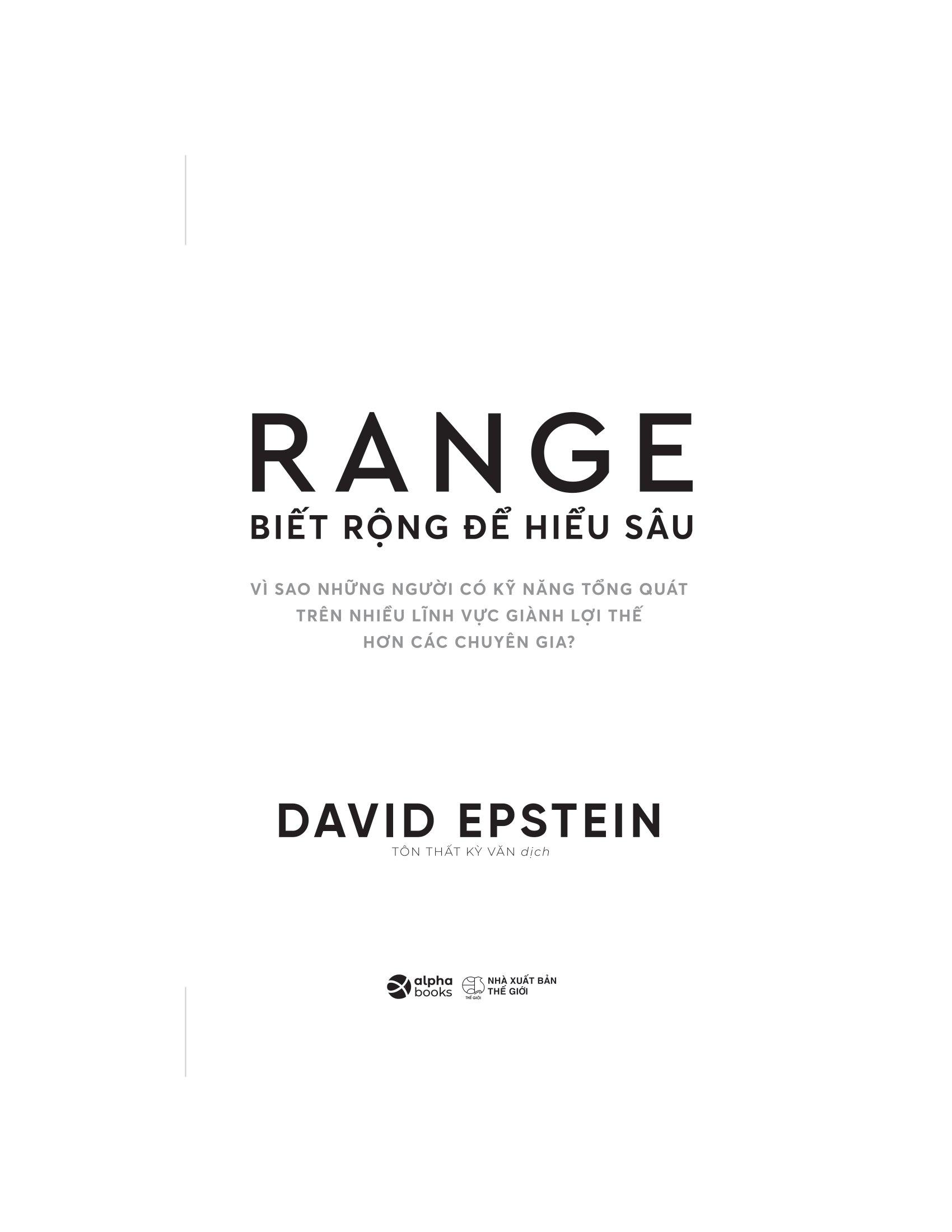 David Epstein đã kiểm tra các vận động viên, nghệ sĩ, nhạc sĩ, nhà phát minh, nhà dự báo và nhà khoa học thành công nhất thế giới. Ông phát hiện ra rằng trong hầu hết các lĩnh vực – đặc biệt là những lĩnh vực phức tạp và khó đoán – những người có tư duy tổng quát (chứ không phải chuyên gia) đều có tố chất xuất sắc. Những người theo chủ nghĩa tổng quát thường tìm ra con đường của m.ình muộn và họ có nhiều mối quan tâm hơn là tập trung vào một. Họ cũng sáng tạo hơn, nhanh nhẹn hơn và có thể tạo ra những kết nối mà những đồng nghiệp chuyên môn hóa không thể nhìn thấy.