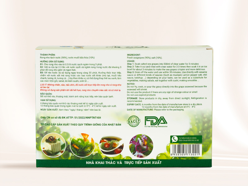 Rong nho Tách nước Natusea của công ty Mitasu 100% organic, đạt chuẩn xuất khẩu được cấp chứng nhận FDA Hoa Kỳ và HACCP. Rong nho Natusea được nuôi trồng và khai thác theo tiêu