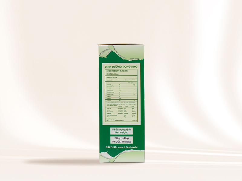 - Thành phần: Rong nho 90%, nước muối bão hoà 10%