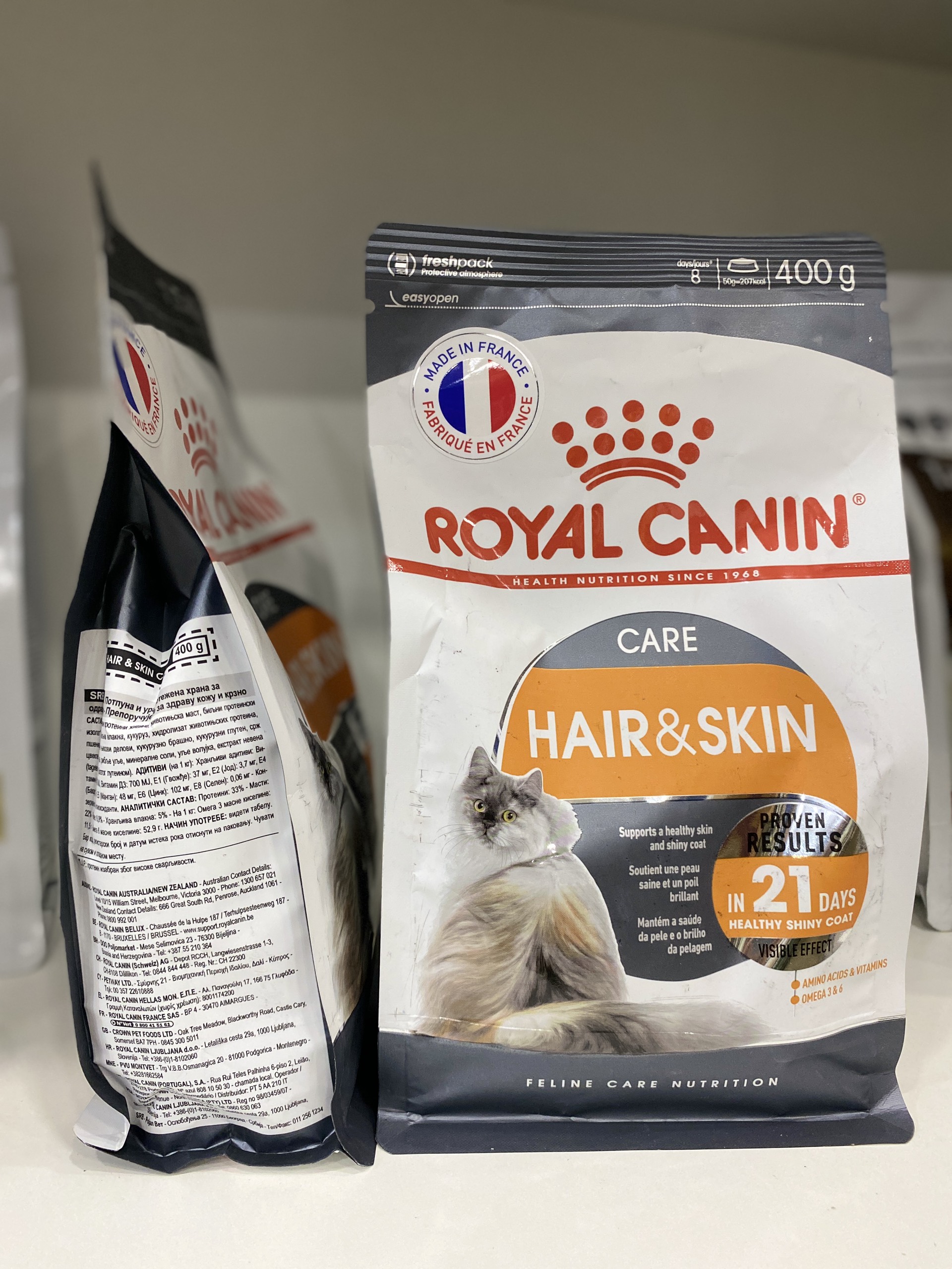 ROYAL CANIN CHĂM SÓC DA VÀ LÔNG-HAIR & SKIN DRY CAT FOOD Dành cho mèo trưởng thành giúp hỗ trợ lông và da khỏe mạnh. Một số mèo sẽ có làn da nhạy cảm và lông dễ rụng, không óng mượt. ROYAL CANIN HAIR & SKIN với nguồn dinh dưỡng cân bằng đóng vai trò quan trọng trong việc làm mới tế bào da, hỗ trợ da và lông khỏe mạnh.