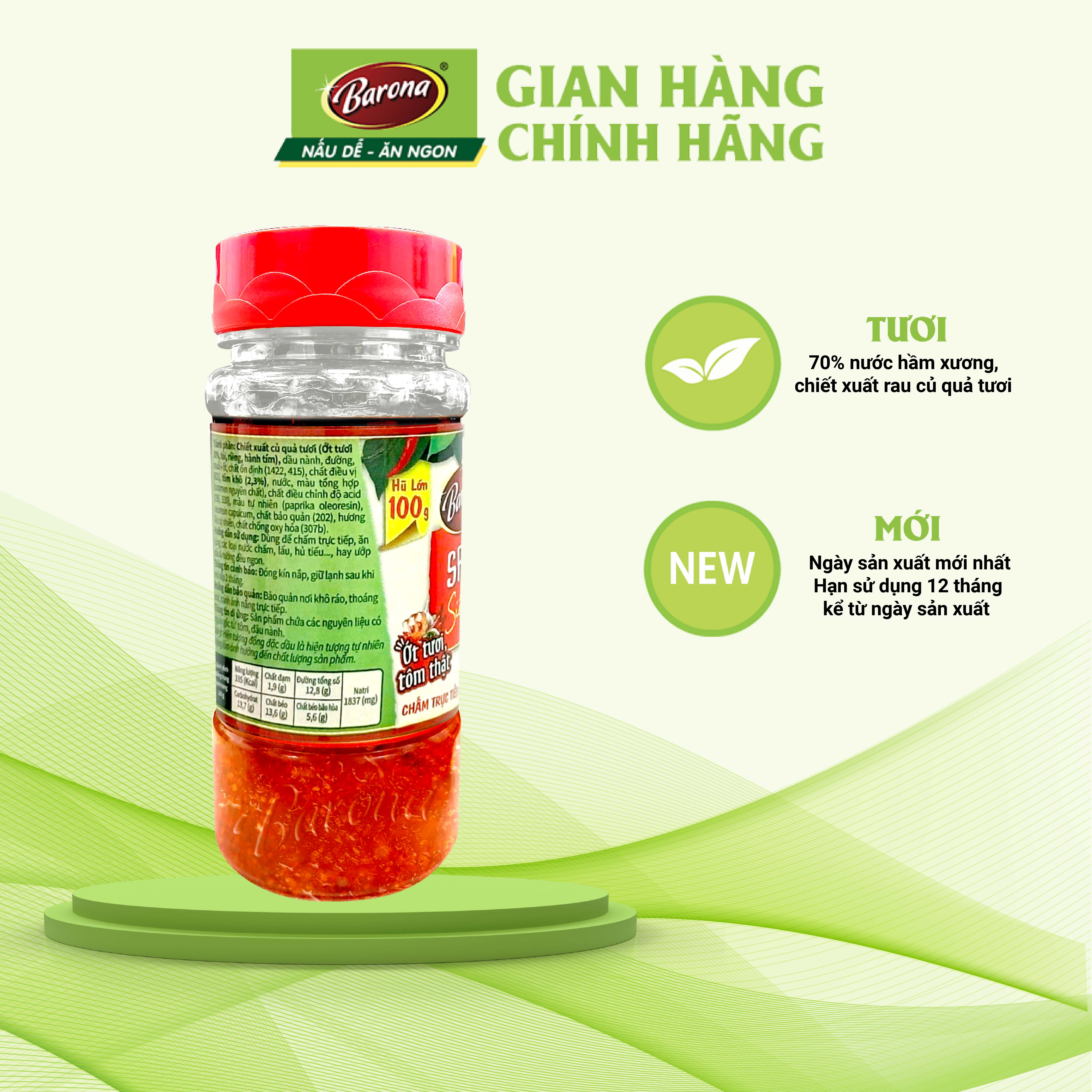 Mua tại TiktokSatế tôm Siêu ngon Barona làm từ ớt tươi được chọn lọc kỹ lưỡng hoà quyện cùng vị tôm khô & tỏi tươi tạo nên hương vị thơm ngon hấp dẫn. Đặc biệt Satế tôm siêu ngon giúp tăng khẩu vị và màu sắc các món ăn kèm như bún, lẩu, hủ tiếu hay dùng để ướp các món nướng đều rất Sản phẩm tiết kiệm hơn với hủ lớn 110g là sự lựa chọn hoàn hảo cho món ngon của bạn. ỚT TƯƠI, TÔM THẬT Hủ lớn, tiết kiệm hơn với 100g (Các sp trên thị trường 85 – 90g) Màu đỏ tươi, đẹp mắt, hương vị thơm ngon kích thích vị giác các món ăn kèm Kết cấu sản phẩm: Hũ nhựa Nhãn giấy, đẹp mắt Có màng seal bảo vệ ở miệng hũ Có màng co nắp màu đỏ in logo Barona Hạn sử dụng: 12 tháng Điều kiện bảo quản: nhiệt độ thường