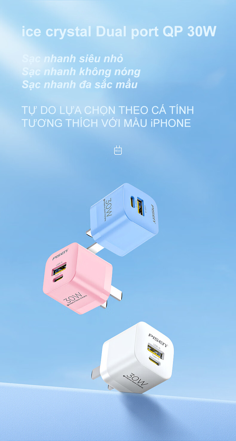 QUICK ICE CRYSTAL QP 20W Sạc nhanh hơn, An toán hơn, tương thích hơn, bền bỉ hơn, mát hơn Kèm bảo hiểm trách nhiệm 46 tỷ đồng Sạc nhanh an toàn. Cổng sạc nhanh kép, công nghệ thông minh Kích thước chỉ bằng khu camera cho iphone 13, không chiếm diện tích ổ cắm , chỉ như ngón cái, không thể có sản phẩm nhỏ hơn