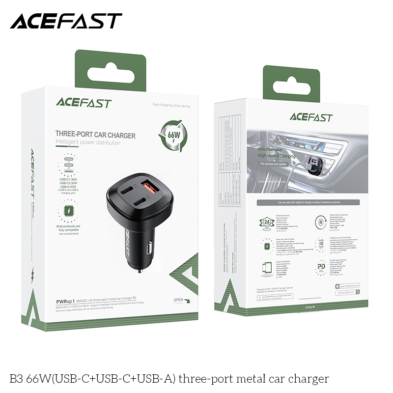 Bộ sạc ô tô ACEFAST B3, tổng công suất 66W, vật liệu thân bằng hợp kim nhôm, hỗ trợ hầu hết các giao thức sạc nhanh Thông số kỹ thuật: - Input: DC12-24V. - Output: USB-C1: 36W, USB-C2: 30W, USB-A: 30W, USB-C1 + USB-C2: 36W + 30W, USB-C1 + USB-A: 36W + 30W, USB-C1 + USB-C2 + USB-A: 5V / 5A. Hỗ trợ cho PD3.0, cho PPS, cho QC4.0, cho AFC, cho FCP, cho SCP và các giao thức sạc nhanh khác.