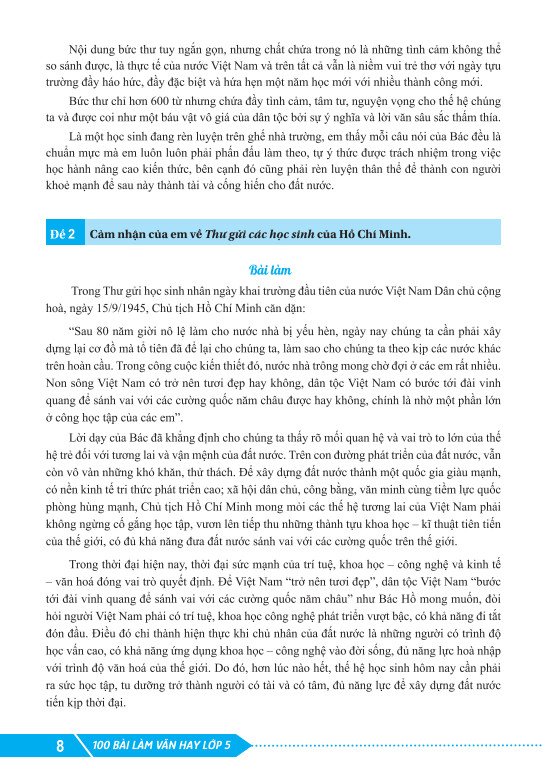 Để giúp các em học tốt môn Tiếng Việt lớp 5, chúng tôi biên soạn cuốn sách: 100 BÀI LÀM VĂN HAY LỚP 5.