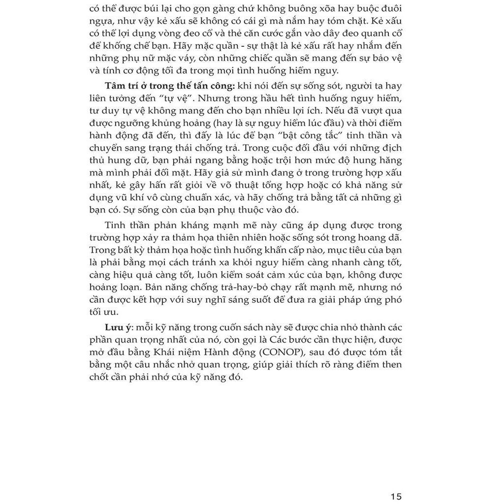 - Số trang: 272 100 KỸ NĂNG SINH TỒN – CUỐN CẨM NANG HƯỚNG DẪN VỀ CÁCH SỐNG SÓT Ở NƠI HOANG DÃ VÀ CHUẨN BỊ CHO MỌI THẢM HỌA Được viết bởi Clint Emerson – một cựu Đặc vụ SEAL, lực lượng tác chiến đặc biệt của Hải quân Hoa Kỳ, cuốn sách 100 kỹ năng sinh tồn của Đinh Tị Books là một trong những cuốn sách bán chạy của New York Times. Rõ ràng, chi tiết và được trình bày dễ hiểu, cuốn sách phác thảo những chiến lược cơ bản nhưng thiết thực giúp bảo vệ bản thân và thoát khỏi những tình huống khó khăn và nguy cấp nhất. Tác giả của cuốn sách là một cựu Đặc vụ SEAL, ông đã dành hai mươi năm chỉ đạo những chiến dịch đặc biệt trên khắp thế giới trong lúc còn gắn bó với Đội Ba SEAL, Cơ quan An ninh Quốc gia Hoa Kỳ (NSA), và Đội Sáu SEAL tinh nhuệ. Những kỹ năng bổ ích của cuốn sách "100 kỹ năng sinh tồn" như thế nào? Những kỹ năng được giới thiệu trong cuốn sách “mang tính sống còn” vì một lí do. Nhiều trong số đó được lấy cảm hứng từ những nhiệm vụ và sự huấn luyện đặc biệt của những đặc vụ thường xuyên bị đẩy đến giới hạn của sức chịu đựng, sự chuẩn xác và tài xoay xở khéo léo trong những điều kiện hiểm nghèo đe dọa đến tính mạng. Một xã hội ngày càng được kết nối toàn cầu đòi hỏi sự chỉ dẫn mới để tồn tại. Bạn sẽ làm gì nếu như một ngày bạn và những người thân yêu bị mắc kẹt giữa vùng lãnh thổ có dịch bệnh hoành hành, lạc ở nơi hoang dã, hay bị móc túi khi đi du lịch ở đất nước xa lạ? Bạn sẽ phản ứng ra sao khi bạn phải thoát ngay khỏi một vụ hỏa hoạn ở nhà cao tầng, bạn phải làm gì để cứu người thân đang mắc kẹt trong vụ hỏa hoạn đó…? Bản kế hoạch thu nhỏ? Tại sao không? Cuốn sách là một bản kế hoạch chi tiết đưa chúng ta trở về những cốt lõi của những kỹ năng đã mất, dạy chúng ta cách xác định phương hướng ở những nơi thiếu vắng các biển báo đường phố hay tín hiệu vệ tinh, đồng thời chuẩn bị cho chúng ta đối mặt với nhiều mối đe dọa mới xuất hiện trong môi trường mà chúng ta đang sống. Rõ ràng, chi tiết và được trình bày dễ hiểu, cuốn sách phác thảo nhiều chi tiết chiến lược giúp bảo vệ bạn và những người bạn yêu thương vượt qua những tình huống khó khăn, nguy hiểm nhất với một sự chuẩn bị cả về vật chất và tinh thần bình tĩnh. Cuốn sách dạy bạn cách suy nghĩ và hành động như một thành viên của lực lượng quân đội tinh nhuệ Hoa Kỳ. Kết Luận Chỉ những sinh vật mạnh mẽ mới có thể sống sót, chỉ những người thông thạo và hiểu biết mới có thể phát triển. Thế giới này chưa từng trở nên an toàn hơn, vì vậy bạn hãy sẵn sàng để luôn đứng vững. Và hãy để cho cuốn sách “100 kỹ năng sinh tồn” chỉ đường cho bạn.