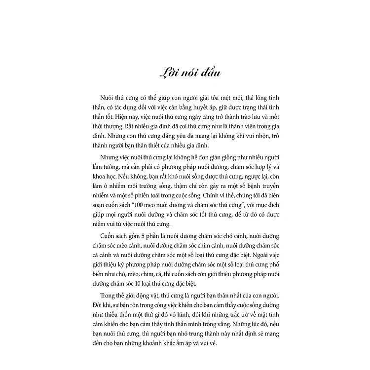 Nhưng việc nuôi thú cưng lại không hề đơn giản giống như nhiều người lầm tưởng, mà cần phải có phương pháp nuôi dưỡng, chăm sóc hợp lý và khoa học. Nếu không, bạn rất khó nuôi sống được thú cưng, ngược lại, còn làm ô nhiễm môi trường sống, thậm chí còn gây ra một số bệnh truyền nhiễm và một số phiền toái trong cuộc sống. Chính vì thế, chúng tôi đã biên soạn cuốn sách “100 mẹo nuôi dưỡng và chăm sóc thú cưng”, với mục đích giúp mọi người nuôi dưỡng và chăm sóc tốt thú cưng, để từ đó có được niềm vui từ việc nuôi thú cưng.