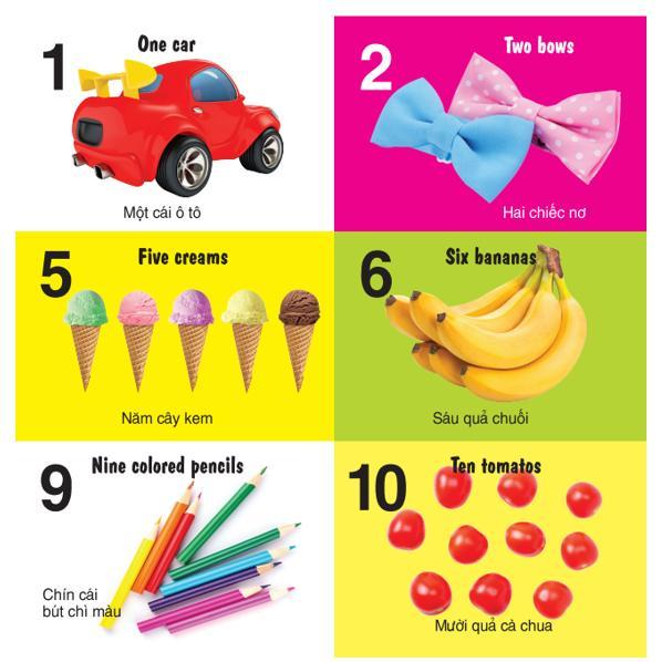 Bộ sách gồm 4 cuốn: số đếm, động vật, phương tiện giao thông, bảng chữ cái màu sắc hình dạng
