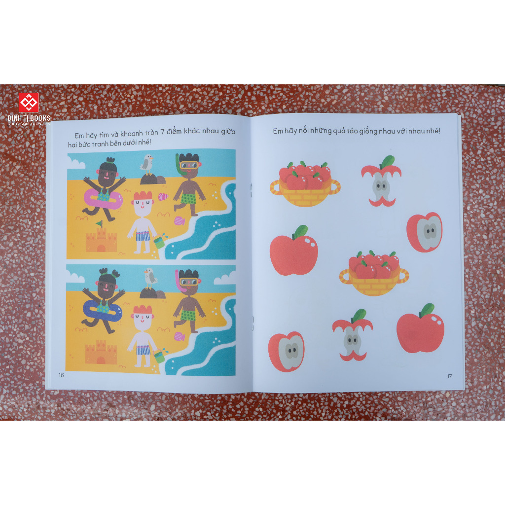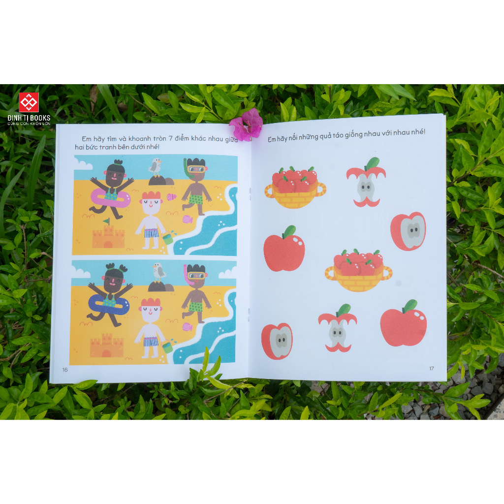 - 30++ hoạt động rèn luyện kỹ năng tư duy cho trẻ - Tìm điểm giống nhau và khác nhau Mỗi cuốn sách là hơn 30 thử thách thú vị, giúp các em rèn luyện kỹ năng tư duy bằng cách: ️SUY LUẬN LOGIC: Vận dụng khả năng suy luận logic để tìm ra đáp án đúng, sắp xếp lại những hình ảnh bị xáo trộn hoặc nối những sự vật có liên quan đến nhau… ️SẮP XẾP THEO THỨ TỰ: Sắp xếp mọi vật theo thứ tự dựa vào kích thước, trọng lượng, số lượng hay các bước thực hiện một việc nào đó… ️TÌM ĐIỂM GIỐNG NHAU VÀ KHÁC NHAU: Nhận biết các vật giống nhau hoặc tìm ra những đối tượng có đặc điểm nào đó khác biệt với những đối tượng còn lại ️GHÉP CẶP hoặc nhóm lại các đối tượng tương tự nhau, giống hệt nhau hoặc liên quan đến nhau…
