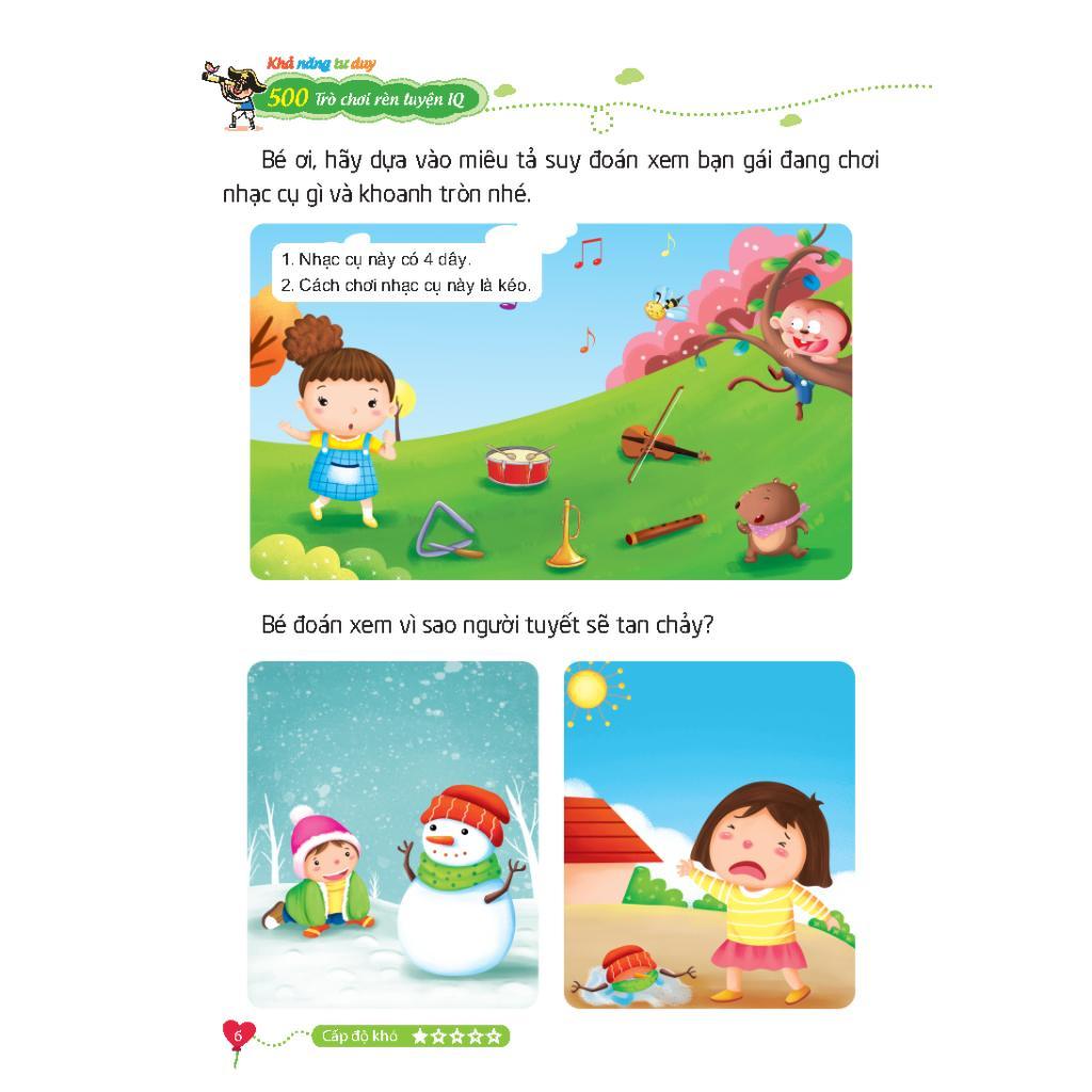 Khả năng tư duy là nhân tố trọng tâm của trí tuệ. Trí tuệ cao hay thấp, chủ yếu được phản ánh thông qua khả năng tư duy. Vậy, rốt cuộc tư duy là gì? Việc rèn luyện tư duy có gì tốt cho trẻ? Việc phát triển đầy đủ khả năng tư duy, nâng cao năng lực học tập có làm cho trẻ tiến bước đến những mục tiêu cao hơn không?... Tất cả sẽ được giải đáp trong bộ sách “500 trò chơi rèn luyện IQ (4-10 tuổi)” được viết trên cơ sở lý luận khoa học này. Toàn bộ các bài luyện tập trong sách đều rất thú vị giống như các trò chơi nhỏ. Và thực tế thì, chơi trò chơi chính là hình thức hoạt động cơ bản về tính hư cấu, tượng trưng, hình tượng rất phù hợp với đặc điểm tư duy của trẻ nhỏ trước khi đi học. Giúp trẻ phát triển đầy đủ trên các phương diện như: tư duy ngôn ngữ, tư duy sáng tạo, tư duy không gian, tư duy logic... cũng như không ngừng thách thức bản thân trẻ, tiến bước đến những mục tiêu cao hơn nữa, tạo ra ảnh hưởng quan trọng đến cả cuộc đời của trẻ...