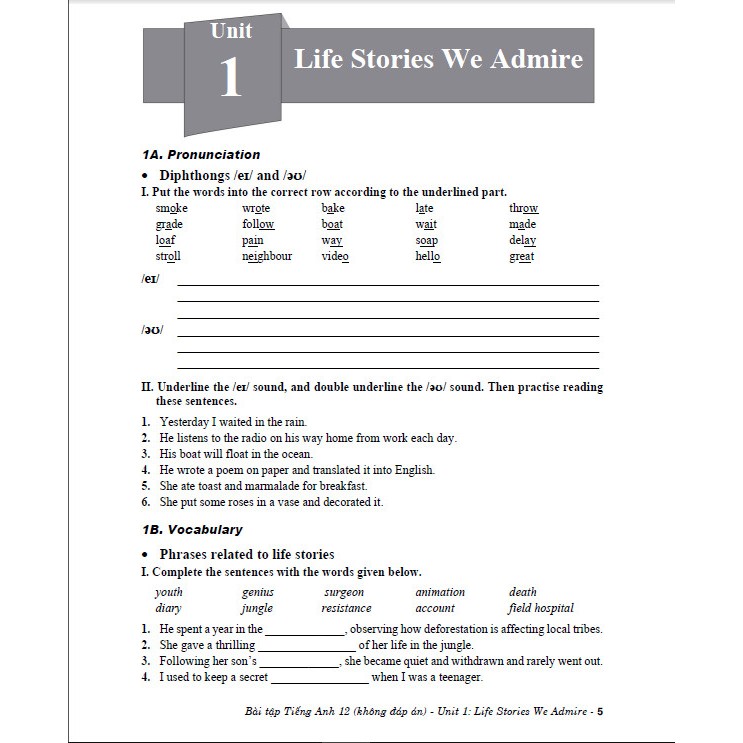Cuốn sách Bài tập Tiếng Anh 12 – Không đáp án gồm 12 đơn vị bài học: Local community; City life; Healthy living for teens; Remembering the past; Our experiences; Vietnamese lifestyle: Then and now; Natural wonders of the world; Tourism; World Englishes; Planet Earth; Electronic devices; Career choices và 4 bài ôn tập Review.