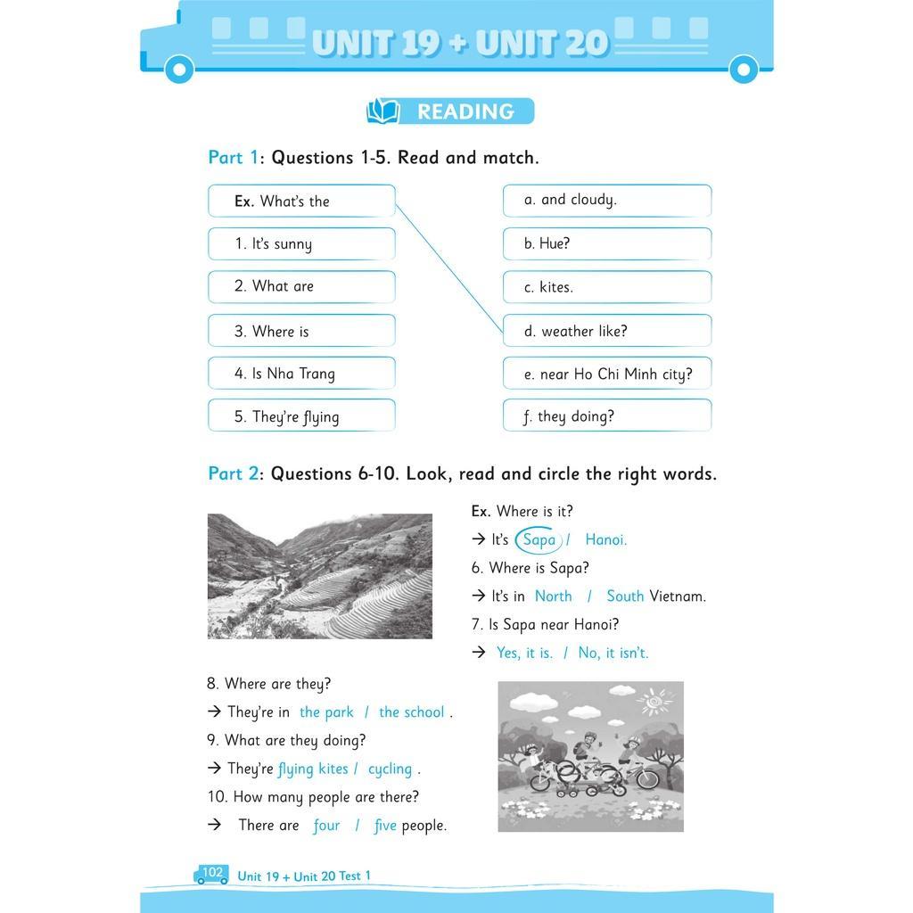 Cứ hai bài sẽ có 2 bài kiểm tra, tất cả các bài kiểm tra đều được thiết kế theo quy định thông tư mới nhất về kiểm tra môn Tiếng Anh tiểu học.