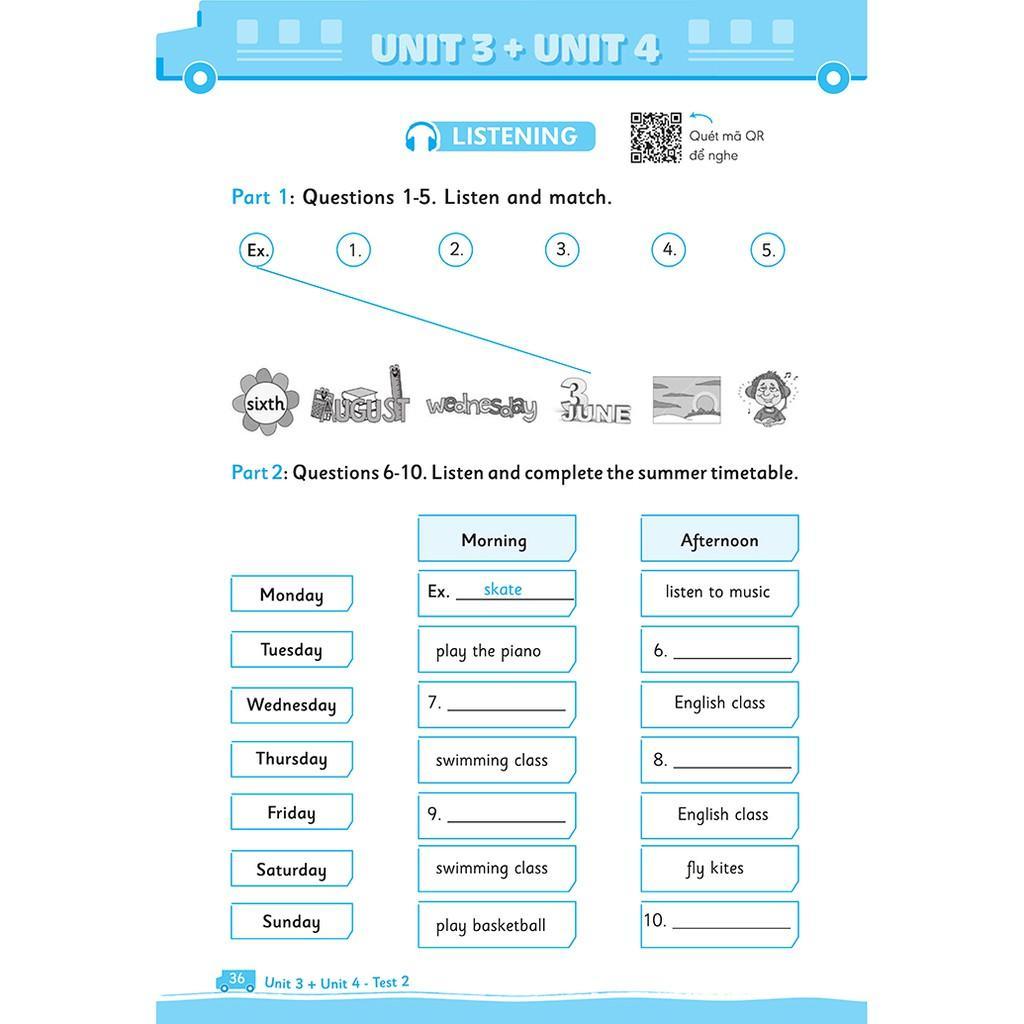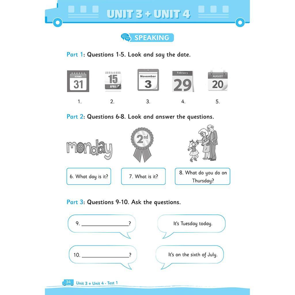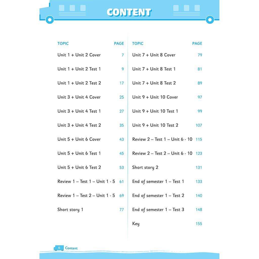 Cứ hai bài sẽ có 2 bài kiểm tra, tất cả các bài kiểm tra đều được thiết kế theo quy định thông tư mới nhất về kiểm tra môn Tiếng Anh tiểu học.