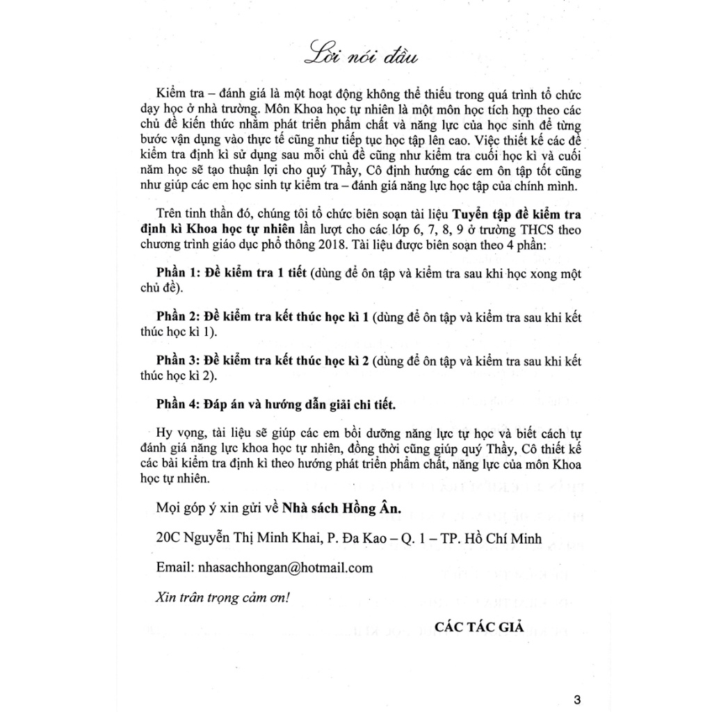 Tuyển Tập Đề Kiểm Tra Định Kì Khoa Học Tự Nhiên Lớp 7 (Theo Chương Trình GDPT Mới)     Kiểm tra - đánh giá là một hoạt động không thể thiếu trong quá trình tổ chức dạy học ở nhà trường. Môn Khoa học tự nhiên là một môn học tích hợp theo các chủ đề kiến thức nhằm phát triển phẩm chất và năng lực của học sinh để từng bước vận dụng vào thực tế cũng như tiếp tục học tập lên cao. Việc thiết kế các đề kiểm tra định kì sử dụng sau mỗi chủ đề cũng như kiểm tra cuối học kì và cuối năm học sẽ tạo thuận lợi cho quý Thầy, Cô định hướng các em ôn tập tốt cũng như giúp các em học sinh tự kiểm tra - đánh giá năng lực học tập của chính mình. Trên tinh thần đó, chúng tôi tổ chức biên soạn tài liệu Tuyển Tập Đề Kiểm Tra Định Kì Khoa Học Tự Nhiên lần lượt cho các lớp 6, 7, 8, 9 ở trường THCS theo chương trình giáo dục phổ thông 2018. Tài liệu được biên soạn theo 4 phần: Phần 1: Đề kiểm tra 1 tiết (dùng để ôn tập và kiểm tra sau khi học xong một chủ đề). Phần 2: Đề kiểm tra kết thúc học kì 1 (dùng để ôn tập và kiểm tra sau khi kết thúc học kì 1). Phần 3: Đề kiểm tra kết thúc học kì 2 (dùng để ôn tập và kiểm tra sau khi kết thúc học kì 2). Phần 4: Đáp án và hướng dẫn giải chi tiết.