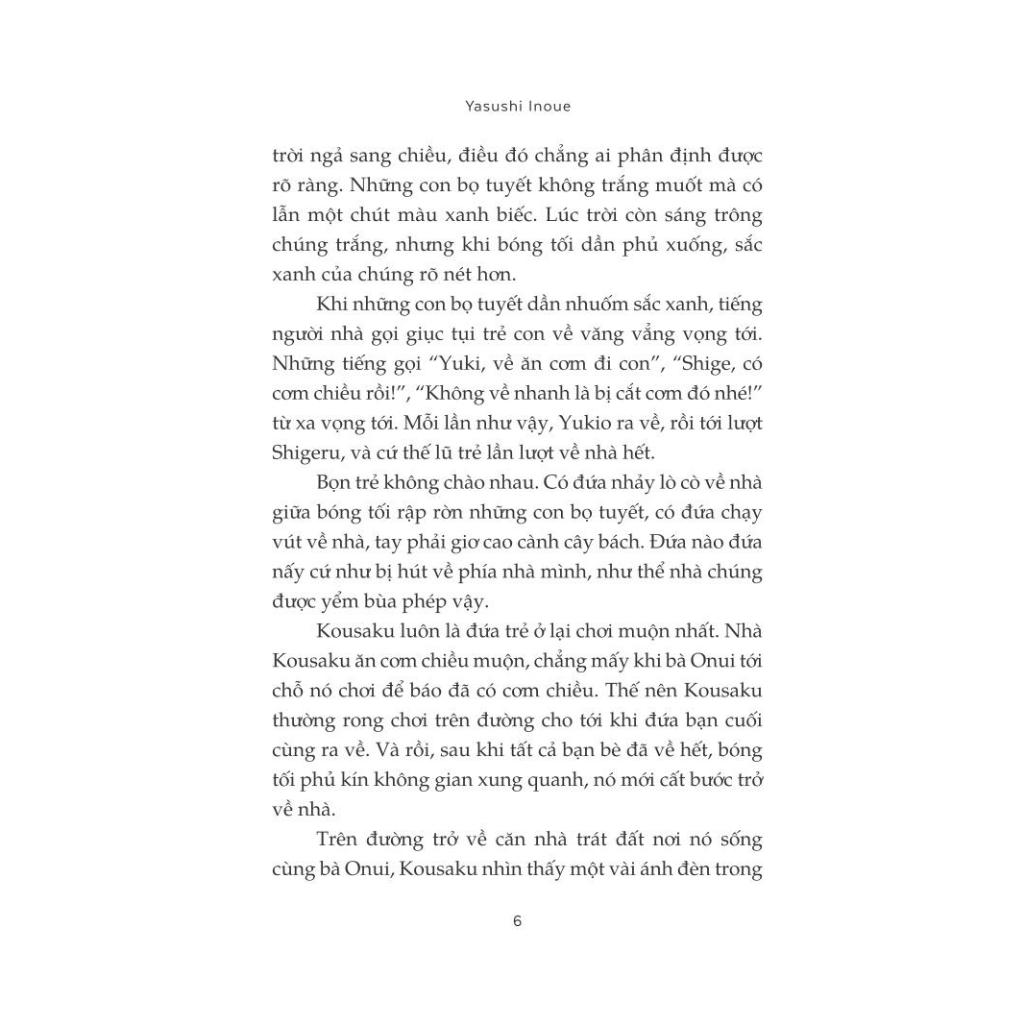 Tác giả: Yasushi InoueDịch giả: Vương Hải YếnNhà xuất bản: Phụ nữSố trang: 336Kích thước: 14x20.5 cmNgày phát hành: 03-2023 Rời xa cha mẹ từ khi mới lên năm, cậu bé Kousaku đến sống cùng bà lão...