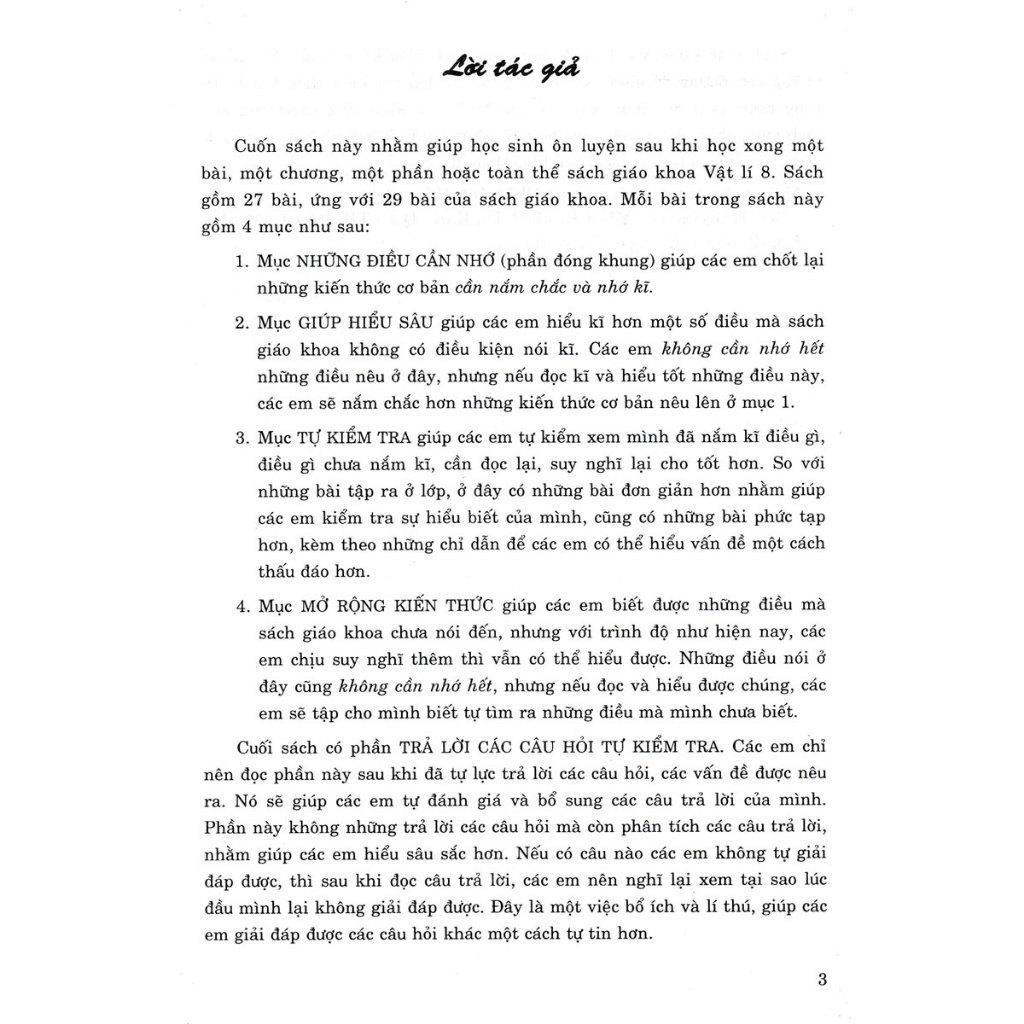 Cuốn sách này nhằm giúp học sinh ôn luyện sau khi học xong một bài, một chương, một phần hoặc toàn thể sách giáo khoa Vật lí 8. Sách gồm 27 bài, ứng với 29 bài của sách giáo khoa. Mỗi bài trong sách này gồm 4 mục như sau: