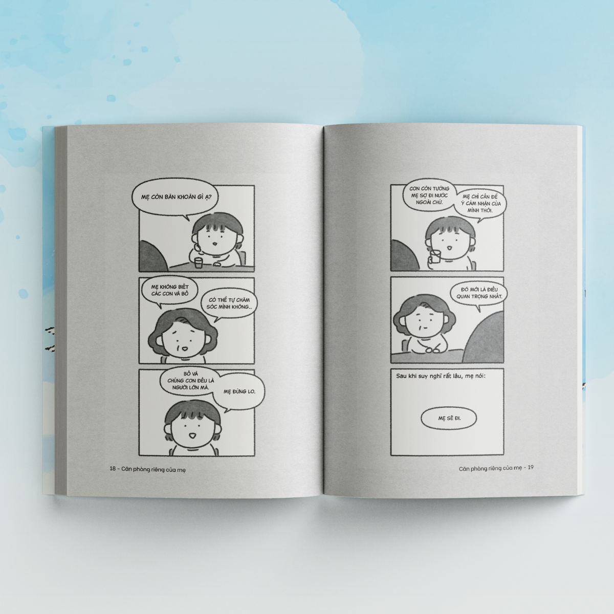 “Căn phòng riêng của mẹ” là cuốn sách tranh kể về một hành trình đầy cảm xúc của người mẹ tuổi 50 đã dám bước ra khỏi vùng an toàn, để bay từ Hàn Quốc đến Việt Nam làm việc. Dù phải rời xa gia đình và cuộc sống thân quen, trải qua nhiều băn khoăn lo lắng, nhưng chính sự thay đổi ấy đã mang đến cho mẹ một căn phòng riêng, một thế giới mới, nơi mẹ có thể theo đuổi cuộc sống m.ình mong ước.