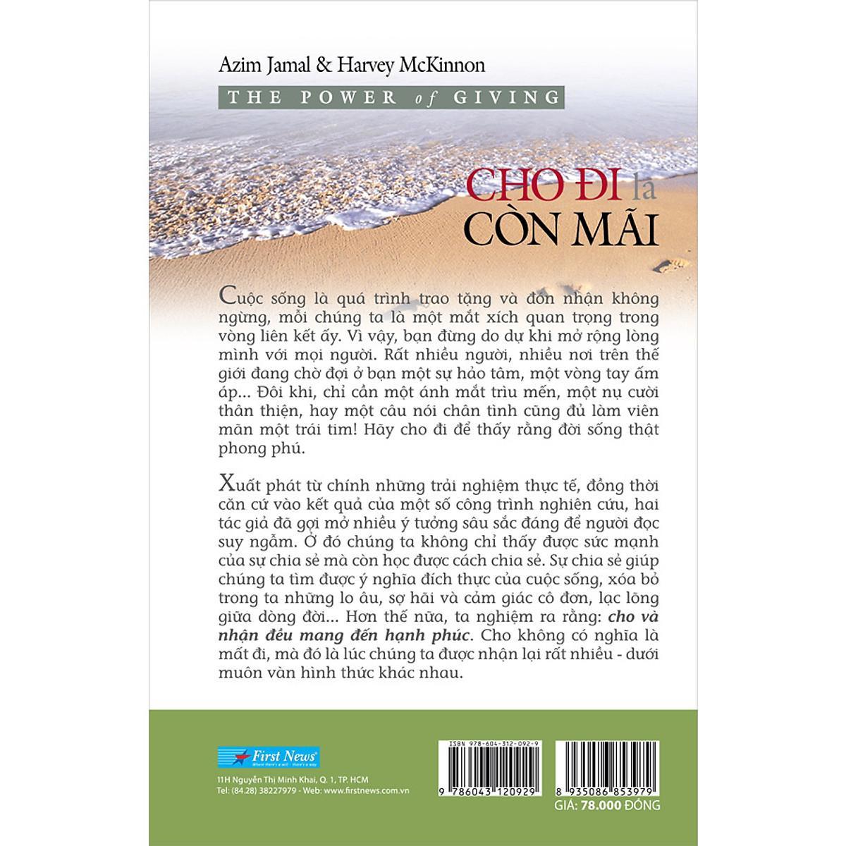 Xuất phát từ chính những trải nghiệm thực tế, đồng thời căn cứ vào kết quả của một số công trình nghiên cứu, hai tác giả đã gợi mở nhiều ý tưởng sâu sắc đáng để người đọc suy ngẫm. Ở đó chúng ta không chỉ thấy được sức mạnh của sự chia sẻ mà còn học được cách chia sẻ. Sự chia sẻ giúp ta tìm được ý nghĩa đích thực của cuộc sống, xoá bỏ trong ta những lo âu, sợ hãi và cảm giác cô đơn, lạc lõng giữa dòng đời. Hơn thế nữa, ta nghiệm ra rằng: cho và nhận đều mang đến hạnh phúc. Cho không có nghĩa là mất đi, mà đó là lúc chúng ra được nhận lại rất nhiều - dưới muôn vàn hình thức khác nhau.
