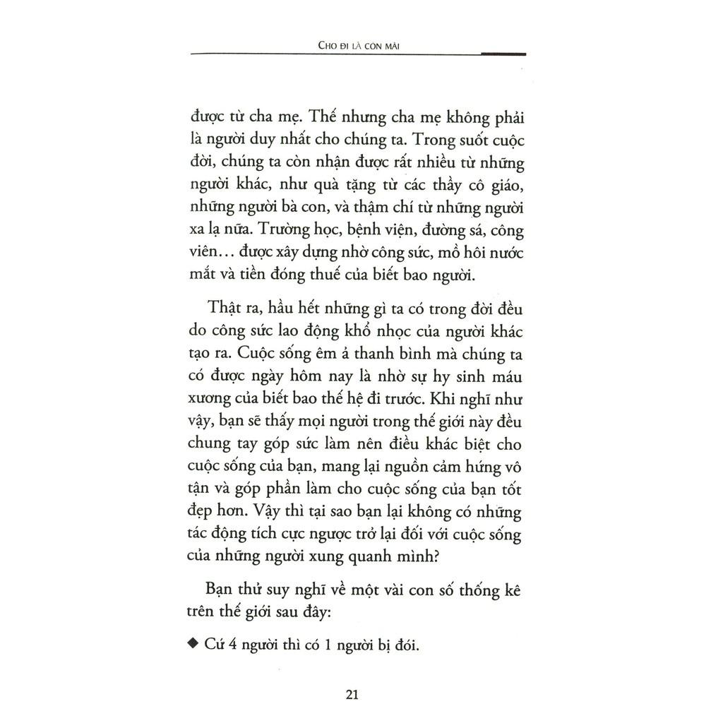 Cuộc sống là quá trình trao tặng và đón nhận không ngừng, mỗi chúng ta là một mắc xích quan trọng trong vòng liên kết ấy. Vì vậy, bạn đừng do dự khi mở rộng lòng mình với mọi người. Rất nhiều người, rất nhiều nơi trên thế giới đang chờ đợi ở bạn một sự hảo tâm, một vòng tay ấm á Đôi khi, chỉ một ánh mắt trìu mến, một nụ cười thân thiện, hay một câu nói chân tình cũng đủ làm viên mãn một trái tim! Hãy cho đi để thấy rằng đời sống thật phong phú.