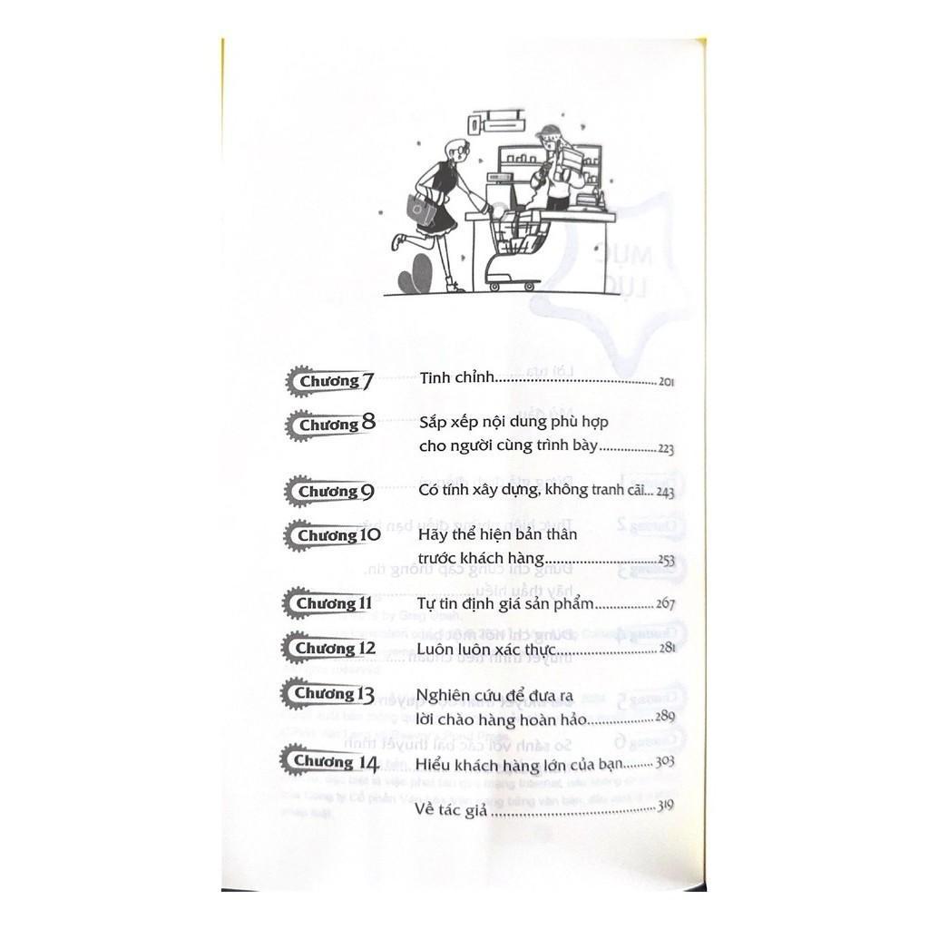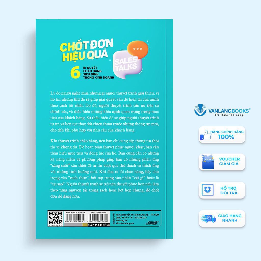 Sách - Chốt Đơn Hiệu Quả Tên Nhà Cung Cấp Cty Văn Hóa Văn Lang Tác giả Greg Upah Người Dịch Minh Trang NXB Thanh Hóa Năm XB 2023 Trọng lượng (gr) 350 Kích Thước Bao Bì 21 x 14 x 1 cm Số trang 320 Hình thức Bìa Mềm Chốt Đơn Hiệu Quả Lý do người nghe mua những gì người thuyết trình giới thiệu, vì họ tin những thứ đó sẽ giúp giải quyết vấn đề hiện tại của mình theo cách tốt nhất. Do đó, người thuyết trình cần ưu tiên sự chính xác, và thấu hiểu những khía cạnh quan trọng trong mục tiêu của khách hàng. Sự thấu hiểu đó sẽ giúp người thuyết trình tự tin và liên tục thay đổi chiến thuật trước những thông tin mới, cho đến khi phù hợp với nhu cầu của khách hàng. Khi thuyết trình chào hàng, nếu bạn chỉ cung cấp thông tin thôi thì sẽ không đủ. Để hoàn toàn thuyết phục người khác, bạn cần thấu hiểu mục tiêu và động lực của họ. Bạn cũng cần có những kỹ năng mềm và phương pháp giúp bạn có những phản ứng “sáng suốt” cần thiết để tự tin vượt qua thử thách và thích ứng với những tình huống mới. Khi đưa ra lời chào hàng, hãy chú trọng vào “cách thức”, bớt tập trung vào phần “cái gì” hoặc là “tại sao”. Người thuyết trình sẽ trở nên thuyết phục hơn nếu làm theo từng nguyên tắc trong sách hoặc kết hợp chúng, để chốt đơn dễ dàng hơn.