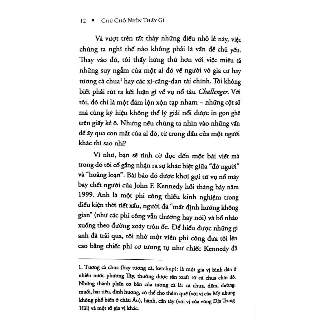 GIỚI THIỆU SÁCH : Chú Chó Nhìn Thấy Gì? (Tái Bản ) Có cấu trúc và giọng văn cân nhắc chỉn chu, song bạn sẽ thấy 19 bài viết trong cuốn sách này đề cập đến những khía cạnh hoàn toàn khác nhau của cuộc sống từ việc: "Mù tạt giờ đây xuất hiện với cả tá chủng loại. Vì đây ketchup vẫn nguyên xi y dạng?" "Những điều về sức khỏe phụ nữ mà cha đẻ của thuốc ngừa thai không hề biết" "Cuộc sống của một người có đáng bị hủy hoại chỉ vì lời buộc tội đạo văn?"... Mỗi bài viết điều có khả năng thu hút bạn, khiến bạn phải ngẫm nghĩ, hay đem lại cho bạn ý niệm lờ mờ nào đó về trí não của kẻ khác". Hãy đọc và cùng khám phá những cuộc phiêu lưu của Gladwell để hiểu rõ hơn những hiện tượng xung quanh bạn, qua đó bồi đắp thêm kinh nghiệm sống cho bản thân. Cuốn sách chia làm ba phần: Phần thứ nhất: Những kẻ ám ảnh, những người tiên phong và những kiểu thiên tài nhỏ lẻ khác Phần thứ hai: Những luận thuyết, tiên lường và chuẩn đoán Phần thứ ba: Nhân phẩm, tính cách và trí tuệ