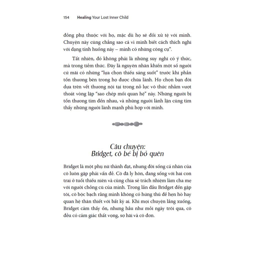 Thông qua các bài tập và câu chuyện của những người đã được chữa lành cũng như của chính tác giả, cuốn sách hướng dẫn làm thế nào để thấu hiểu “đứa trẻ tổn thương” bên trong chính mình và cách để kết nối phần nội tâm này với “phần trưởng thành”. Chẳng hạn như nhìn lại dòng sự kiện thời thơ ấu, viết thư trao đổi giữa phần trưởng thành và phần tổn thương, liên hệ những phản ứng bốc đồng trong hiện tại với nguyên nhân trong quá khứ… Việc viết những lá thư chữa lành qua lại với chính mình là một cách tuyệt vời để nhanh chóng làm bộc lộ những cảm xúc và kết nối với phần tổn thương bên trong bạn. Bạn đọc cũng sẽ hiểu cách mà “phần người lớn có trách nhiệm” có thể phát triển một bộ công cụ hồi đáp mới, tích cực hơn, thay thế cho những kiểu phản ứng cũ của đứa trẻ tổn thương bên trong.