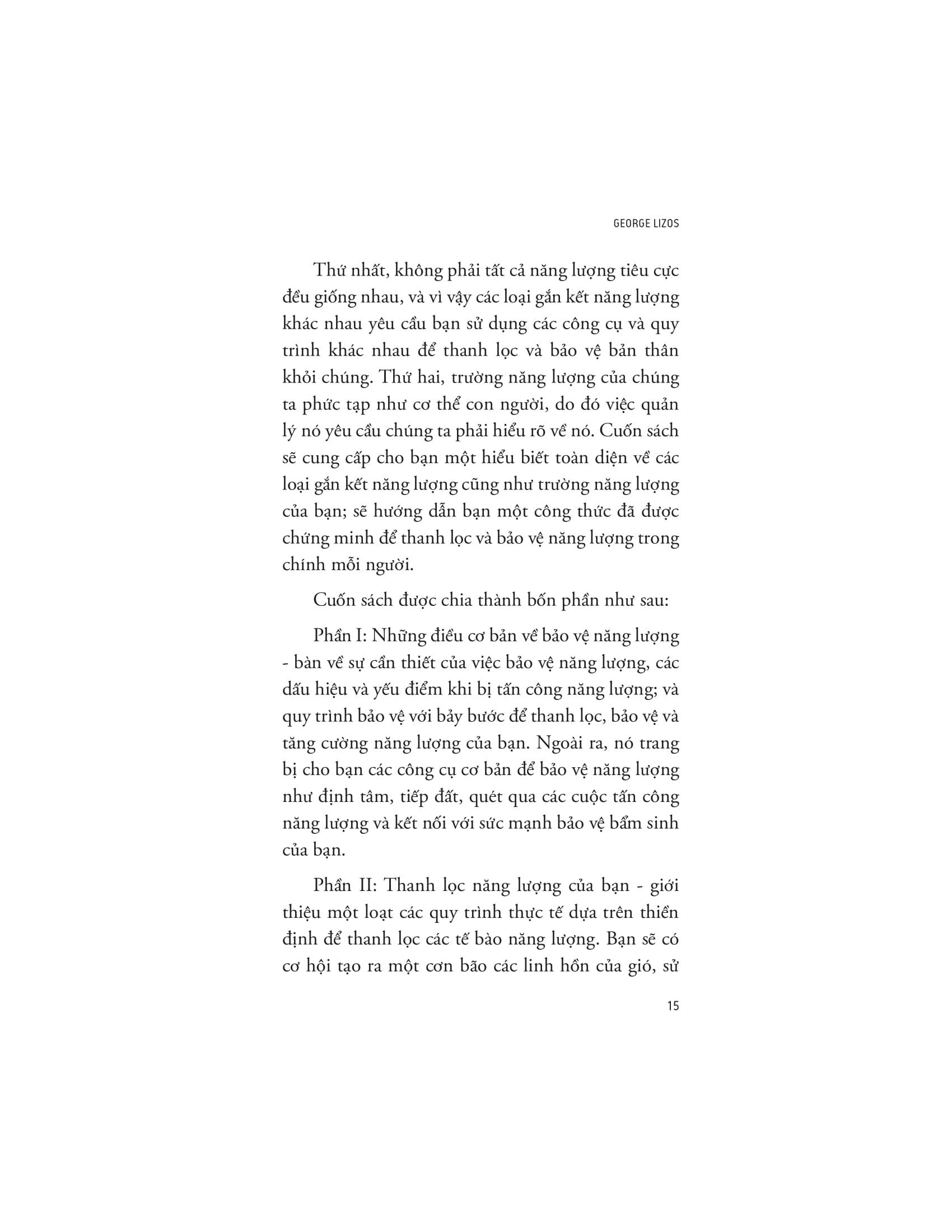 Tác giả George Lizos định nghĩa bảo vệ năng lượng là nghệ thuật duy trì suy nghĩ, cảm xúc và hành vi không bị tác động bởi môi trường xung quanh. Sách giới thiệu cách thiết lập ranh giới năng lượng rõ ràng, quản lý tương tác để giữ vững tính xác thực cá nhân. Qua đó bạn sẽ học được cách: