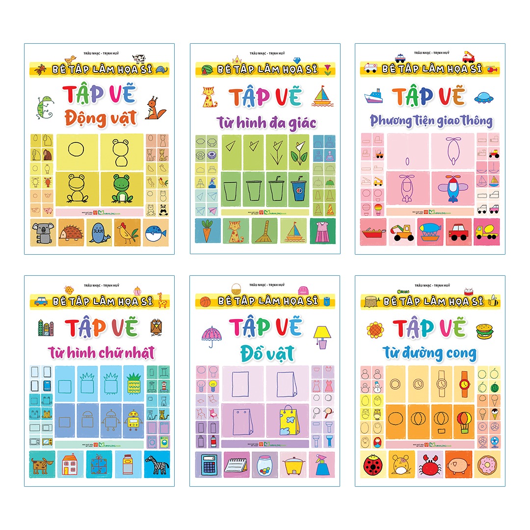 Bằng cách ghép các hình khối cơ bản, điểm và đường như hình vuông, hình chữ nhật, hình tam giác, hình tròn, đường thẳng, đường gấp khúc, đường lò xo, vào với nhau là đã có thể tạo nên được một bước tranh đơn giản mà đẹp. Bộ sách giúp trẻ nắm được những kĩ thuật vẽ đơn giản nhất giúp trẻ rèn luyện sự khéo léo của đôi tay, biểu đạt tình cảm đối với cuộc sống tươi đẹp xung quanh cũng như bồi dưỡng tâm hồn nghệ thuật cho các bé.