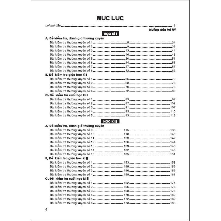 Các đề kiểm tra được sắp xếp theo học kì I và học kì II. Trong mỗi học kì đều có ba dạng đề kiểm tra: