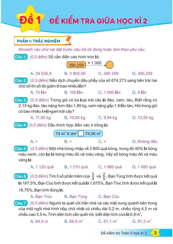 Đề kiểm tra Toán 5 – Học kì 1 – Cánh diều là cuốn sách được biên soạn theo chương trình sách giáo khoa mới, định hướng phát triển năng lực. Cuốn sách gồm 20