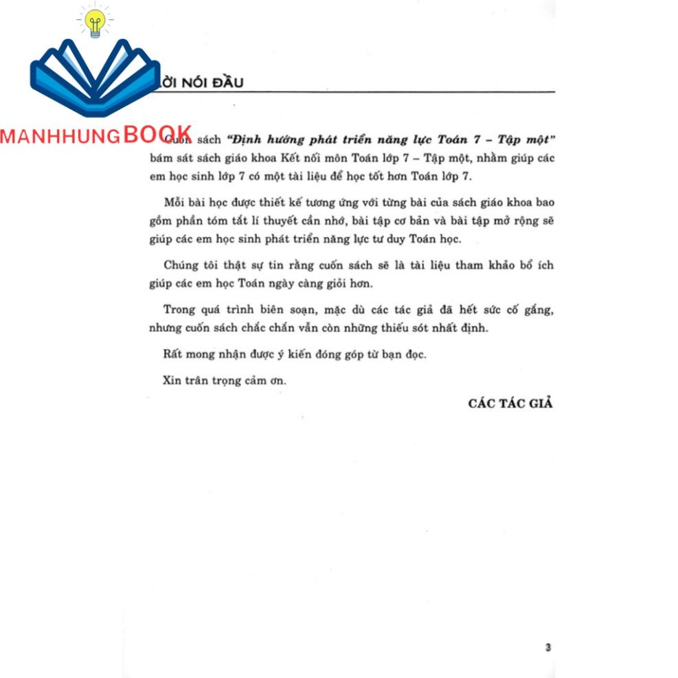 Cuốn sách Định Hướng Phát Triển Năng Lực Toán 7 - Tập 1 (Bám Sát SGK Kết Nối) bám sát sách giáo khoa Kết nối môn Toán lớp 7 - Tập một, nhằm giúp các em học