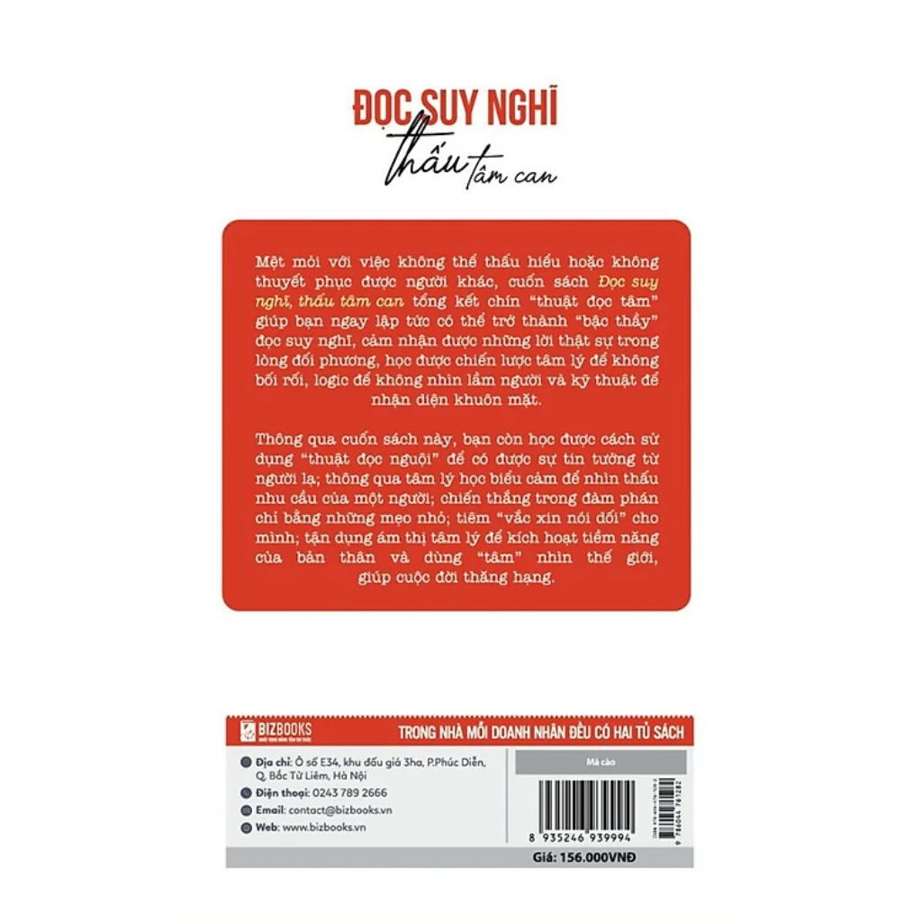 Sách - Đọc Suy Nghĩ, Thấu Tâm Can - Đọc Vị Để Giao Tiếp Và Ứng Xử Tốt Hơn Trong Mỗi Tình Huống - MCBooks   Lưu ý: Chỉ có sách chính hãng mới có thể quét mã QR-code để nhận các bản Audiobooks - Sách nói đi kèm   Nội dung cuốn Sách - Đọc Suy Nghĩ, Thấu Tâm Can - Đọc Vị Để Giao Tiếp Và Ứng Xử Tốt Hơn Trong Mỗi Tình Huống - MCBooks   “Họa hổ họa bì nan họa cốt, tri nhân tri diện bất tri tâm” (Vẽ hổ vẽ da khó vẽ xương. Biết người biết mặt khó biết lòng). Thật khó để nhìn thấu bên trong một người, nhưng cái gì càng khó, con người lại càng muốn biết. Biết để tránh bị lừa dối, chứ không phải để lừa dối người khác.   Đọc vị để giao tiếp và ứng xử tốt hơn trong mỗi tình huống chứ không phải nịnh bợ. Nhìn thấu để hiểu chứ không phải để thao túng. Cuốn sách “Đọc suy nghĩ, thấu tâm can” là cuốn sách giúp bạn nắm bắt được những kỹ thuật về đọc tâm.   Cuốn sách Đọc suy nghĩ, thấu tâm can tóm tắt 9 kỹ năng đọc tâm trí biến bạn trở thành người đọc hiểu được suy nghĩ của người xung quanh mình trong vài giây, học được chiến lược tâm lý để không bị bối rối bởi đối phương.   Trong cuốn sách này, bạn sẽ học được cách nhanh chóng chiếm được lòng tin của người lạ; hiểu nhu cầu của người khác thông qua tâm lý học biểu hiện nhỏ; kỹ năng đàm phán và giao tiếp giành chiến thắng 100%; sử dụng tâm lý ám thị để kích thích tiềm năng bản thân; sử dụng "trái tim" để nhìn thế giới, để cuộc sống không ngừng được cải thiện.    Nội dung cuốn sách Đọc suy nghĩ, thấu tâm can Chương 1: Nói vui về thuật đọc tâm Chương 2: Bạn có đôi mắt, nhưng bạn có đang “nhìn” không? Chương 3:“ngón nghề” không mấy người biết của các thầy bói: thuật đọc nguội Chương 4: Cách tư duy của người đọc tâm Chương 5: Tất cả mọi sự kiểm soát đều bắt nguồn từ mô phỏng Chương 6: “Vắc xin” nói dối Chương 7:Manh mối đọc tâm ẩn giấu trong các nền tảng xã hội Chương 8: Cả đời chỉ cần hiểu một từ “yêu”. Chương 9: Mua và bán trong mắt người đọc tâm Chương 10: Đọc tâm hiểu người chỉ là để trở thành một phiên bản tốt hơn của chính mình   Đọc tâm điển hình trong cuộc sống, vì sao chúng ta cần biết?   Một cô gái chất vấn bạn trai: “Anh đang mập mờ với cô ta đúng không?” Lúc này, mắt cô ấy nhìn thẳng vào bạn trai, mọi lời nói và hành động của người bạn trai trở thành vật tham chiếu để cô ấy kiểm chứng việc bạn trai đang thành thật hay nói dối.   Nêu biểu hiện của anh ta trở nên thiếu tự nhiên, giống những lần nói dối trước đó, cô bạn gái lập tức đoán được rằng bạn trai mình đang không thành thật, lý do rất đơn giản, cô ấy đã có sự ước đoán mang tính suy xét, liên hệ với kinh nghiệm trong quá khứ. Nếu biểu hiện của bạn trai nằm ngoài phạm vi kinh nghiệm của cô ấy, cô ấy sẽ không thể đưa ra phán đoán. Từ đây, chúng ta không khó để nhận ra, kiểu ước đoán mang tính suy xét này thường cho ra những phán đoán sai lầm.   Vì thế, những kỹ thuật đọc vị làm giảm bớt những tình huống nằm ngoài phạm vi và những sai lầm. “Đọc suy nghĩ, thấu tâm can” cho bạn biết nhiều cách dựa vào những đặc trưng và biểu cảm để phán đoán đối phương: Sử dụng thuyết mô phỏng, phát hiện nói dối, thông qua quan sát từ bộ phận đến tổng thể…   Chúng ta nghiên cứu thuật đọc tâm không chỉ là để tìm hiểu một vài việc, mà là để kiểm soát, thay đổi và khiến mọi thứ trở nên tốt hơn.   Trong cuốn sách này, tác giả nhắc đến mỗi kỹ thuật tâm lý nổi tiếng là “Đọc nguội”.   Đọc nguội là một kĩ thuật giao tiếp và nắm bắt lòng người lợi hại. Đây là kĩ thuật dựa vào cử chỉ, hành vi, ngôn từ của người khác để từ đó đưa ra phán đoán về tính cách, tâm lý, hành động của họ. Bản chất của thuật đọc nguội là khai thác những điểm yếu bên trong con người, khơi gợi và đánh thức thức khao khát, tính cách trong mỗi người.    Qua đó, kỹ thuật này vạch trần một hiện tượng tâm lý chung của con người đó là: Mọi người thường cho rằng một bản miêu tả tính cách chung chung, có tính phổ biến sẽ tiết lộ rất chính xác đặc điểm của một người, khi mọi người dùng những tính từ thông thường, mơ hồ và phạm vi ám chỉ rất rộng để mô tả ai đó, người ta rất dễ dàng chấp nhận những miêu tả ấy, đồng thời cho rằng những lời đó miêu tả chính mình.   Thông tin chi tiết cuốn Sách - Đọc Suy Nghĩ, Thấu Tâm Can - Đọc Vị Để Giao Tiếp Và Ứng Xử Tốt Hơn Trong Mỗi Tình Huống - MCBooks