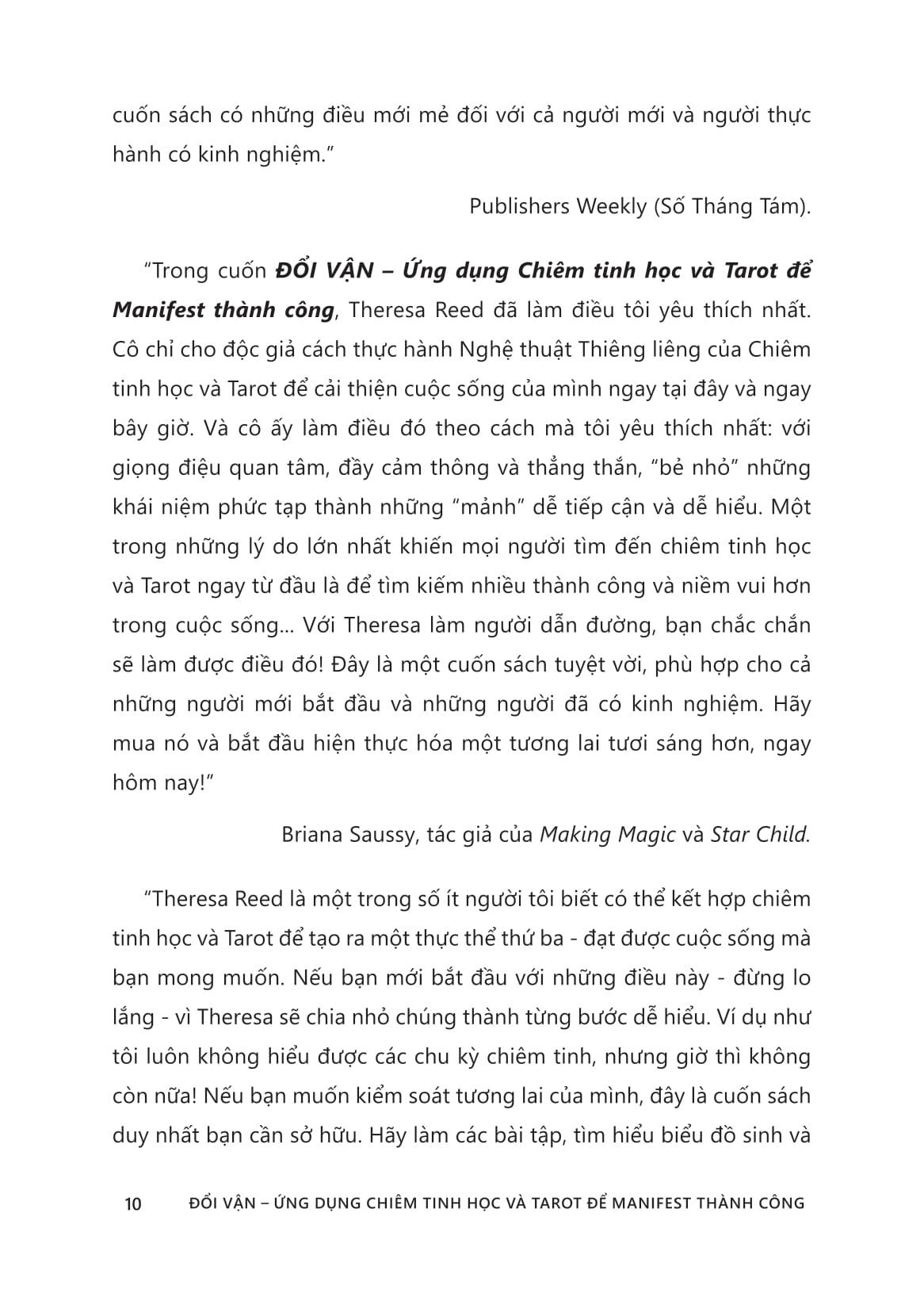 Trong ĐỔI VẬN – Ứng dụng Chiêm tinh học và Tarot để Manifest thành công, “Quý bà Tarot” Theresa Reed sẽ hướng dẫn bạn cách xây dựng con đường thành công bằng cách sử dụng chiêm tinh và Tarot để khai phá, đánh thức những tiềm năng độc đáo của bản thân và những thử thách bạn sẽ gặp trong hành trình cuộc đời. Cuốn sách này sẽ giúp bạn:
