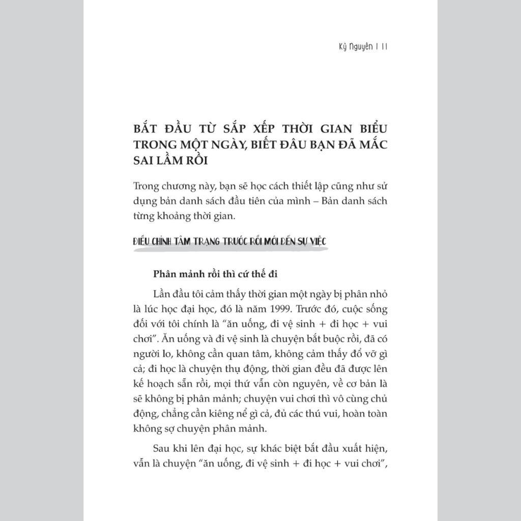 1. Thoát khỏi sự chi phối của thời gian, bận rộn nhưng lại cảm giác không làm được gì Cách để sắp xếp gọn gàng những công việc hàng ngày, chia mỗi ngày thành từng khoảng thời gian; tối ưu hoá những khoảng thời gian thông qua việc thành lập quy luật làm việc và nghỉ ngơi hợp lý; đồng thời đừng quên xem xét ý nghĩa của khoảng thời gian buổi tối và buổi sáng.