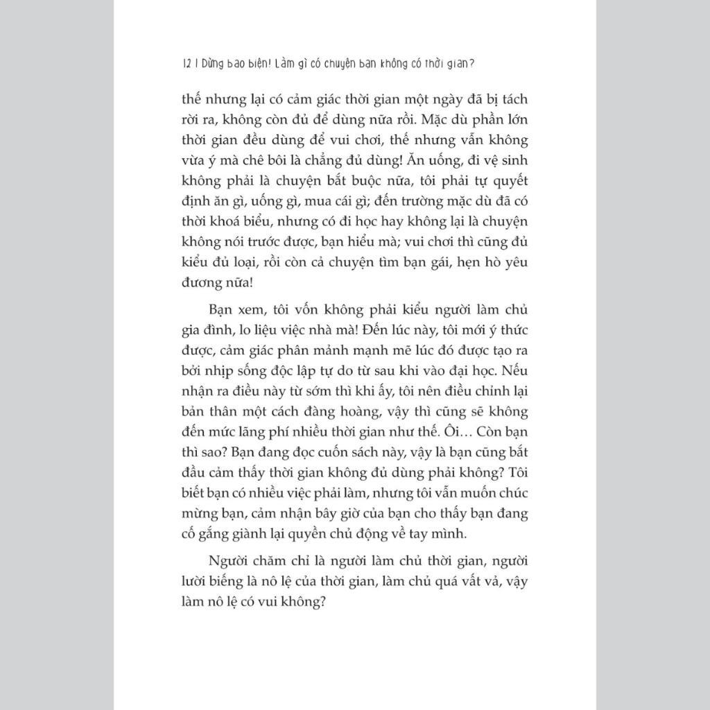 3. Phương pháp đạt hiệu quả cao mà ít tốn sức Cung cấp những phương pháp liên quan đến sự kiên trì để nỗ lực không còn là lời nói suông và trừu tượng, đồng thời hình thành thói quen phân chia thời gian hiệu quả một cách lâu dài và thoát khỏi sự chật vật của những công việc đang ngốn thời gian của bạn. Với những nghiên cứu và phương pháp được tác giả chia sẻ trong cuốn sách, hy vọng sẽ giúp bạn tối ưu được thời gian, hãy làm chủ nó, đừng để nó chi phối, và “Ngừng bao biện”, bạn lúc nào cũng có thời gian. Thông tin chi tiết cuốn Sách - Dừng Bao Biện! Làm Gì Có Chuyện Bạn Không Có Thời Gian - MCBooks