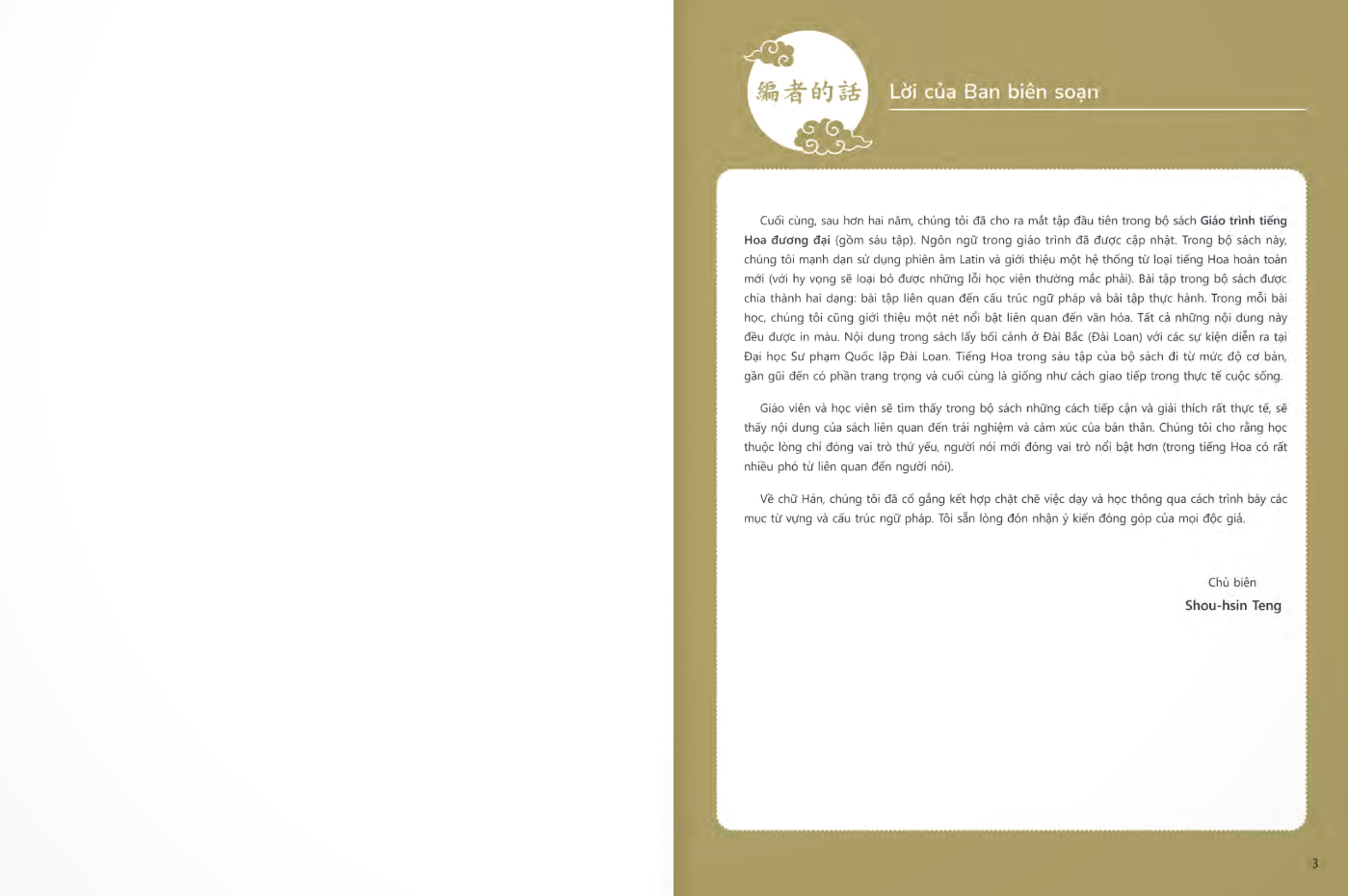 Giáo Trình Tiếng Hoa Đương Đại - Sách Bài Học 1-3 Bộ sách dành cho học sinh đến Đài Loan học tiếng Hoa và cũng là giáo trình phù hợp với học sinh, sinh viên nước ngoài học ngoại ngữ là tiếng Hoa, được biên soạn dựa theo Khung tham chiếu năng lực ngoại ngữ chung của châu Âu (CEFR), Hướng dẫn của Hội đồng Giảng dạy Ngoại ngữ Hoa Kỳ (ACTFL). Đặc điểm của bộ giáo trình: