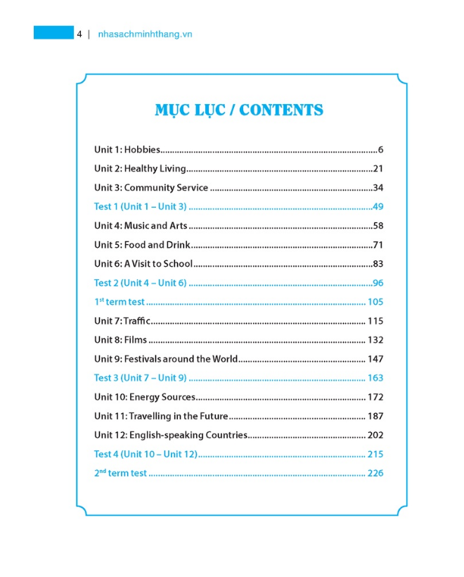 Bài tập tiếng Anh lớp 7 (không đáp án)   Sách bài tập tiếng anh lớp 7 được biên soạn dành cho học sinh lớp 7, do Nhà xuất bản Đại học Quốc gia Hà Nội phát hành. Dựa vào phương pháp dạy ngôn ngữ giao tiếp (Communicative Language Teaching Method), sách tập trung vào việc phát triển các kỹ năng ngôn ngữ cho học sinh Trung học cơ sở thông qua các dạng bài bổ ích, trong đó tập trung vào luyện ngữ âm, từ vựng, kỹ năng đọc hiểu, kỹ năng viết và sử dụng ngôn ngữ tổng hợp thông qua các bài kiểm tra (Tests), giúp cho các em học sinh có thể tổng hợp kiến thức hiệu quả nhất.   bài tập tiếng anh lớp 7 được biên soạn bám sát chương trình mới của Bộ Giáo dục & Đào tạo với các chủ điểm quen thuộc với học sinh lớp 7 như: MY NEW SCHOOL (Trường học mới của tôi); MY HOME (Gia đình tôi); MY FRIENDS (Các bạn tôi); MY NEIGHBOURHOOD (Hàng xóm của tôi); NATURAL WONDERS OF THE WORLD (Kỳ quan thiên nhiên thế giới); OURTETHOLIDAY (Ngày Tết của chúng tôi); TELEVISION (Truyền hình); SPORTS AND GAMES (Trò chơi và thể thao); CITIES OF THE WORLD (Các thành phố trên thế giới.