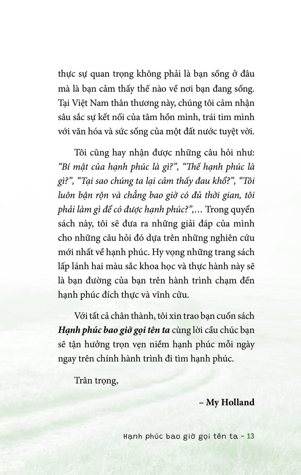 Cuốn sách "Hạnh Phúc Bao Giờ Gọi Tên Ta" của tác giả My Holland là một hành trình khám phá sâu sắc về khái niệm hạnh phúc và cách để từng bước xây dựng nó trong cuộc sống hằng ngày. Được viết bằng giọng văn chân thành, gần gũi, cuốn sách không chỉ mang đến những lý thuyết về tâm lý học mà còn là những trải nghiệm thực tế, bài học quý giá từ chính cuộc sống của tác giả.