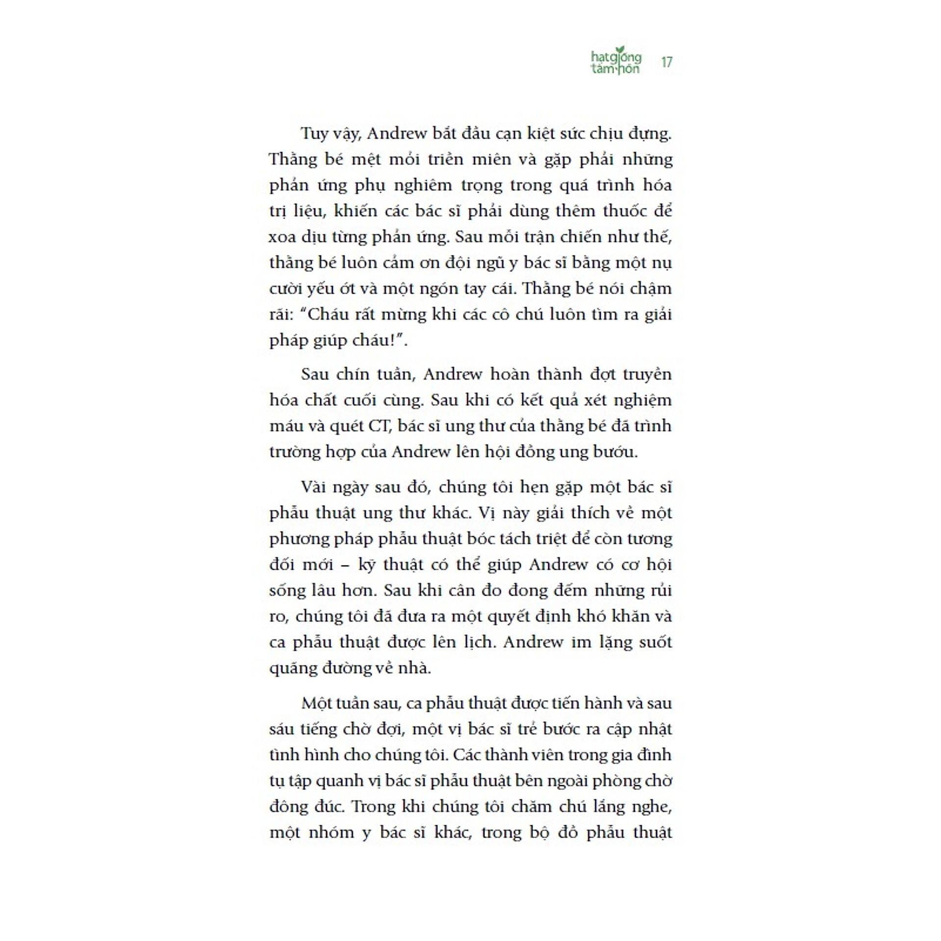 Cuộc sống hiện đại với những muộn phiền, lo toan, đôi lúc khiến ta cảm thấy căng thẳng, bất an. Mỗi ngày đi qua, chúng ta giữ lại những năng lượng tiêu cực tích tụ bên trong mình. Chúng không chỉ ảnh hưởng đến cuộc sống cá nhân mà còn có thể vô tình khiến ta làm tổn thương người khác. Vậy làm thế nào để thoát khỏi tình trạng đó? Câu trả lời sẽ được tìm thấy trong quyển sách của tác giả . Quyển sách gồm 25 câu chuyện ngắn truyền cảm hứng, giúp bạn đọc có thêm niềm tin và sức mạnh để vượt qua những thách thức trong cuộc sống. Với lối viết dung dị, gần gũi, mỗi câu chuyện trong sách bàn về cách chúng ta vun trồng những hạt mầm hy vọng bé nhỏ ngay trong những cơn bão dữ dội nhất, những ngày mưa dai dẳng nhất hay những mùa đông băng giá nhất. Chúng nhắc nhở chúng ta rằng, mọi gian khó rồi cũng sẽ qua đi. Nhưng để làm được điều đó, ta cần trang bị sự mạnh mẽ, lòng quyết tâm và kiên trì để vượt qua mọi khó khăn, sóng gió trong cuộc đời. Như câu chuyện về cô gái giai đoạn cuối trong truyện ngắn Tấm bản đồ kho báu, người luôn kiên trì theo đuổi các mục tiêu của mình trên “bản đồ kho báu” – chính là danh sách những điều cô muốn làm hoặc muốn hoàn thành trong tương lai – để từ đó có cơ hội nhìn lại toàn bộ hành trình mình đã đi. Hay câu chuyện về người mẹ hàng ngày chứng kiến giai đoạn “bình thường mới" của cô con gái sau một vụ tai nạn kinh hoàng. Những nhân vật trong chính là những tấm gương sáng trên hành trình khai phá sức mạnh tiềm ẩn bên trong mỗi người. Trước đó, họ có thể đã mất tiền, mất việc làm, mất nhà cửa hoặc ít nhất là phải cắt giảm chi tiêu. Nhiều người còn đối mặt với những thảm họa thiên nhiên, những biến cố lớn về sức khỏe, thậm chí mất người thân trong gia đình. Nhưng tất cả đã cùng vượt qua nghịch cảnh, đoàn kết với nhau, đối mặt với thử thách và tìm kiếm niềm hy vọng mới giữa cuộc sống bộn bề. Bên cạnh đó, quyển sách còn là câu chuyện về tình yêu, sự tha thứ, lòng bao dung để từ đó dạy cho chúng ta có một trái tim rộng mở để yêu thương, sự chính trực để biết những việc đúng đắn cần làm, và một tâm trí sáng suốt để biết nên làm việc đó như thế nào, và cả những yếu tố bên ngoài – như sự may mắn hay tình yêu thương, giúp đỡ và đồng hành của những người xung quanh. Lật giở từng trang sách, bạn có thể bắt gặp hình ảnh của chính mình trong các câu chuyện, từ đó giúp ươm mầm hy vọng với niềm tin rằng ngày mai sẽ tốt đẹp hơn. Qua thời gian, chúng sẽ phát triển thành những chồi non tràn đầy sức sống. Quyển sách giúp ta hiểu được sức mạnh của mục tiêu và hy vọng trong cuộc sống. Bởi trong sâu thẳm trái tim mỗi người đều cất giữ một khát vọng sống mãnh liệt, nhưng không phải ai cũng có đủ dũng khí để rộng mở trái tim đón nhận những điều tốt đẹp của cuộc sống. là quyển sách có thể song hành cùng bạn trong khoảng thời gian “vun trồng” nhân cách, niềm tin, lòng trắc ẩn và tìm thấy hy vọng ở những khoảng thời gian đen tối nhất cuộc đời. Quyển sách mở ra một thế giới với những câu chuyện mà bạn có thể chiêm nghiệm, đồng cảm, từ đó rút ra những bài học giá trị cho cuộc sống của mình và những người xung quanh. Khép lại quyển sách, độc giả sẽ học được cách cân bằng cuộc sống để hướng đến điều tích cực, vượt qua nỗi sợ hãi, khó khăn để hướng đến mục tiêu hoàn thiện bản thân. Dù bạn là chồi non hay đã là môt cây cao đang vươn mình trưởng thành, chúng ta cũng đều cần một nguồn năng lượng tích cực để nuôi dưỡng hy vọng, chắt lọc những thứ tốt đẹp để vun đắp tâm hồn, bền bỉ vượt qua mọi chông gai trong cuộc sống.