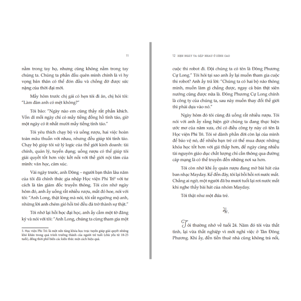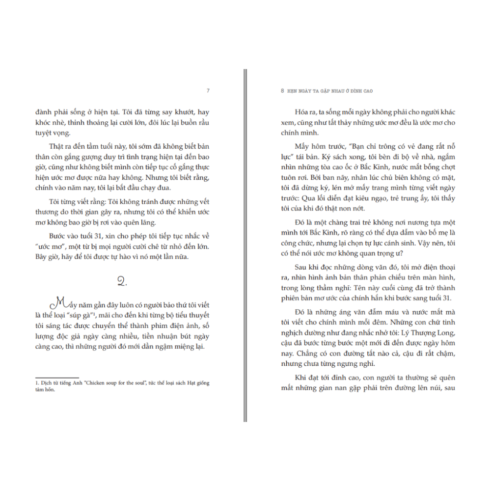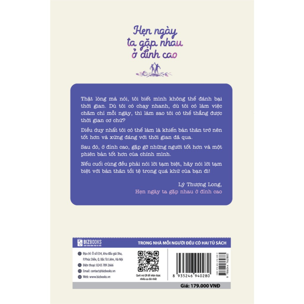 Sách - Hẹn Ngày Ta Gặp Nhau Ở Đỉnh Cao - MCBooks     Nội dung cuốn Sách Hẹn Ngày Ta Gặp Nhau Ở Đỉnh Cao - MCBooks   Thật lòng mà nói, tôi biết mình không thể đánh bại thời gian. Dù tôi có chạy nhanh, dù tôi có làm việc chăm chỉ mỗi ngày, thì làm sao tôi có thể thắng được thời gian cơ chứ?   Điều duy nhất tôi có thể làm là khiến bản thân trở nên tốt hơn và xứng đáng với thời gian đã qua.   Sau đó, ở đỉnh cao, gặp gỡ những người tốt hơn và một phiên bản tốt hơn của chính mình.   Nếu cuối cùng đều phải nói lời tạm biệt, hãy nói lời tạm biệt với bản thân tồi tệ trong quá khứ của bạn đi!   Lý Thượng Long, “Hẹn ngày ta gặp nhau ở đỉnh cao”   LÝ THƯỢNG LONG   Tác giả có sách bán chạy nhất, người sáng lập Học viện Feichi, đạo diễn và biên kịch trẻ.   Năm 2010, anh giành giải quán quân Bắc Kinh và giải ba toàn quốc trong cuộc thi tài năng tiếng Anh "Star of Hope" của CCTV.   Vào năm 2015, đồng sáng lập Kaochong.com và vào năm 2018, công ty đã nhận được khoản tài trợ vòng D.   Các cuốn sách đã xuất bản: • Bạn chỉ tưởng là mình đang rất cố gắng (2015) • Cái gọi là ổn định của bạn chỉ đang lãng phí cuộc sống của bạn (2016) • Vươn lên hoặc bị đánh bại (2017) • Tiểu thuyết "Gai" (2018) • Không nỗ lực đừng tham vọng (2018) • Tiểu thuyết "Thiết kế nhân vật" (2019) • Ba mươi tuổi, mọi thứ chỉ mới bắt đầu (2020)   Thông tin chi tiết cuốn sách Sách Hẹn Ngày Ta Gặp Nhau Ở Đỉnh Cao - MCBooks